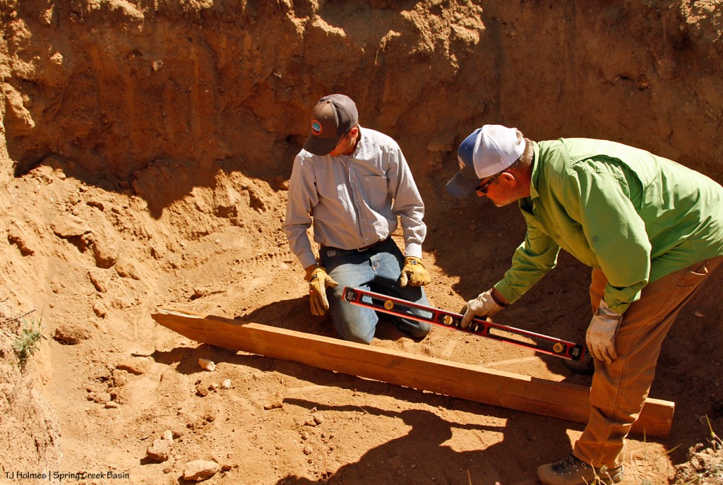 In addition to cleaning out the holes, Mike and Garth checked the level of the bottom to make sure it was prepared for the tanks to sit level right when they went in the holes.