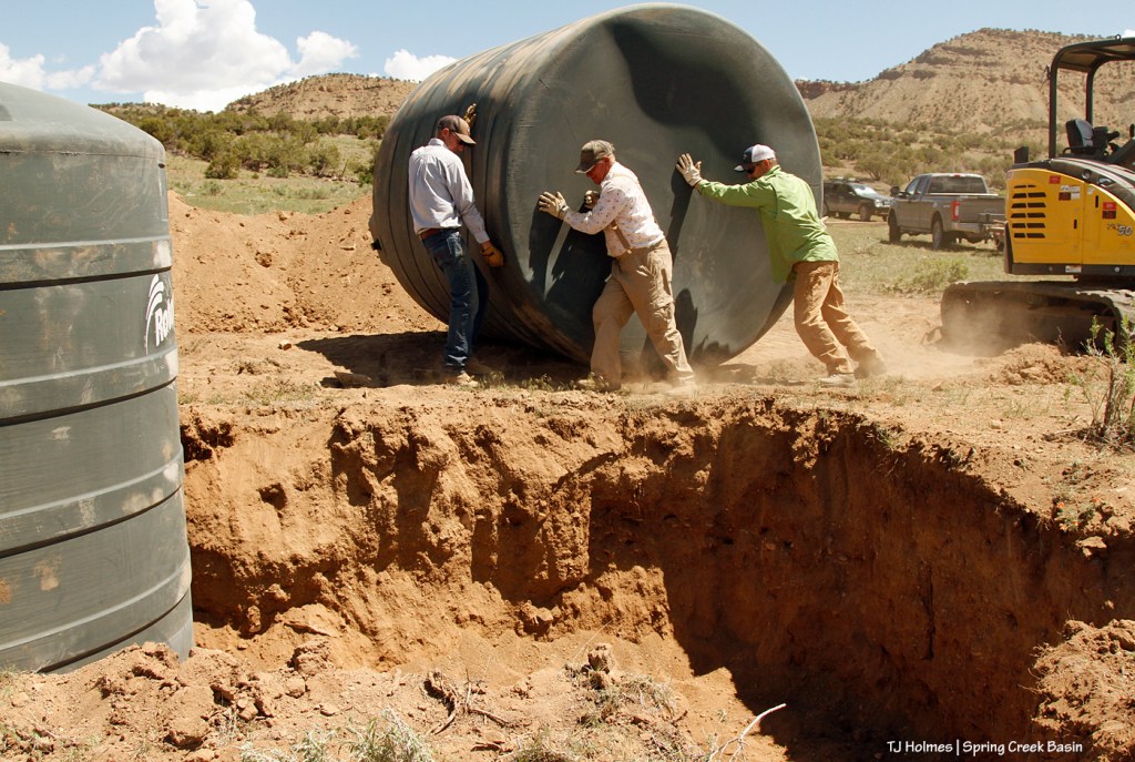 Lots of dust is created by powdery dirt when a 3,500-gallon water tank drops over the edge after four brawny guys push it into a hole! Don’t worry, the tank won’t sit like that. This is a capture of a split second before the tank rocked back to flat on its base.