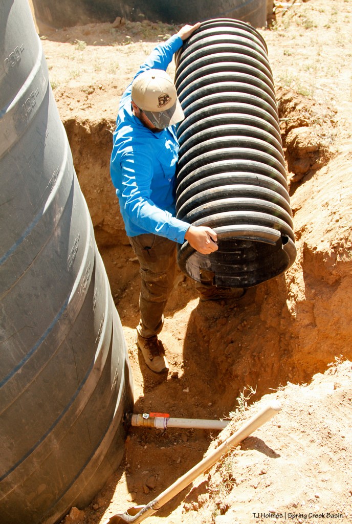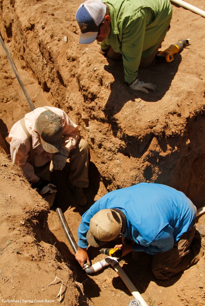 This was the last day of work a couple of days ago because – wonder of wonders! – we got nearly a full day of drizzle that Friday. To catch you up, the tanks are now installed, and the trenches mostly dug, so the guys put together the pipes from the tanks to a main line, then connected that line to a line down to the location where the trough will be located.