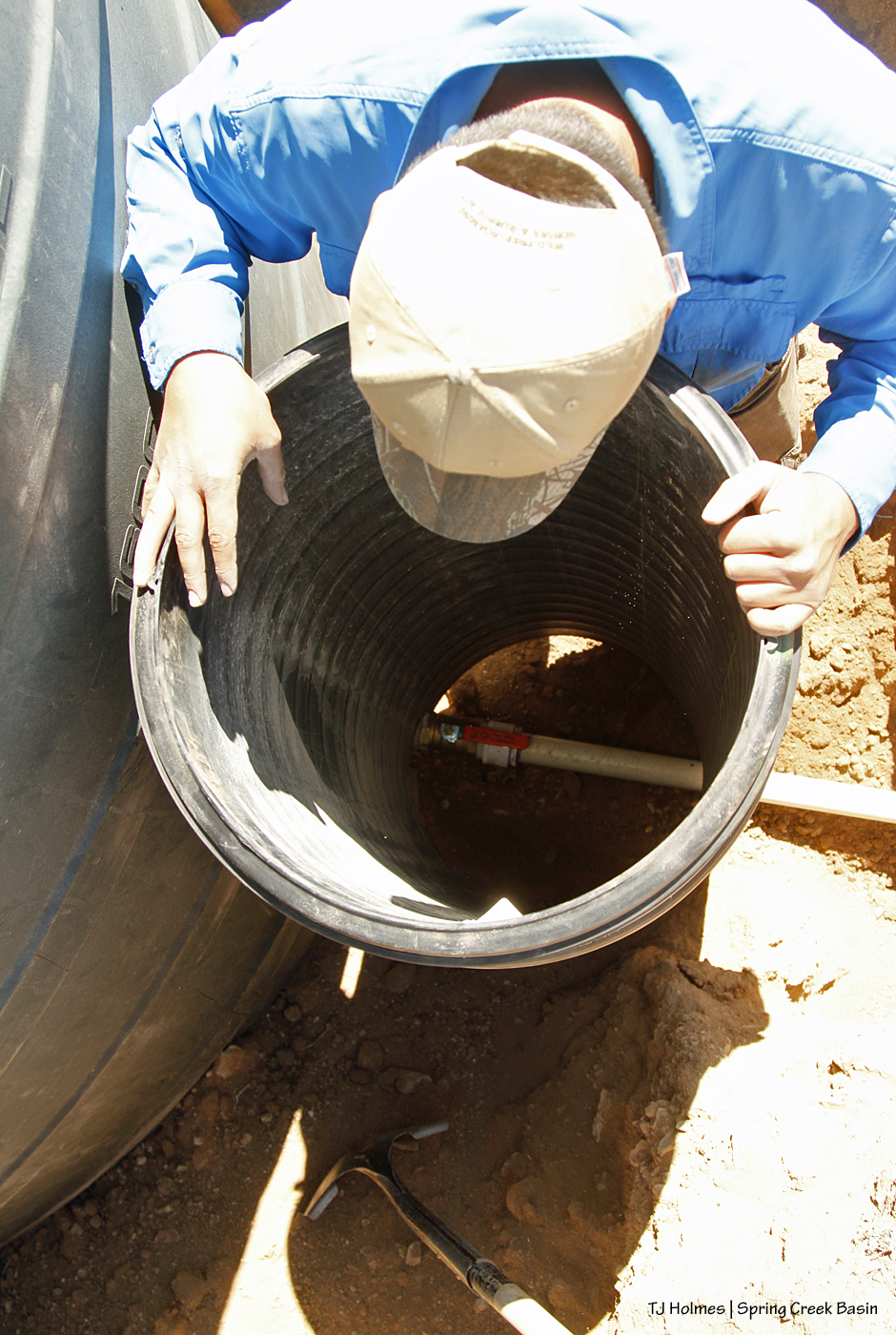 The guys brought a length of heavy-duty plastic culvert, and Daniel and I cut it in 4.5-foot lengths to serve as valve protectors. He also cut little “mouse holes” so the pipe could sit down on the dirt over the valve and pipe.