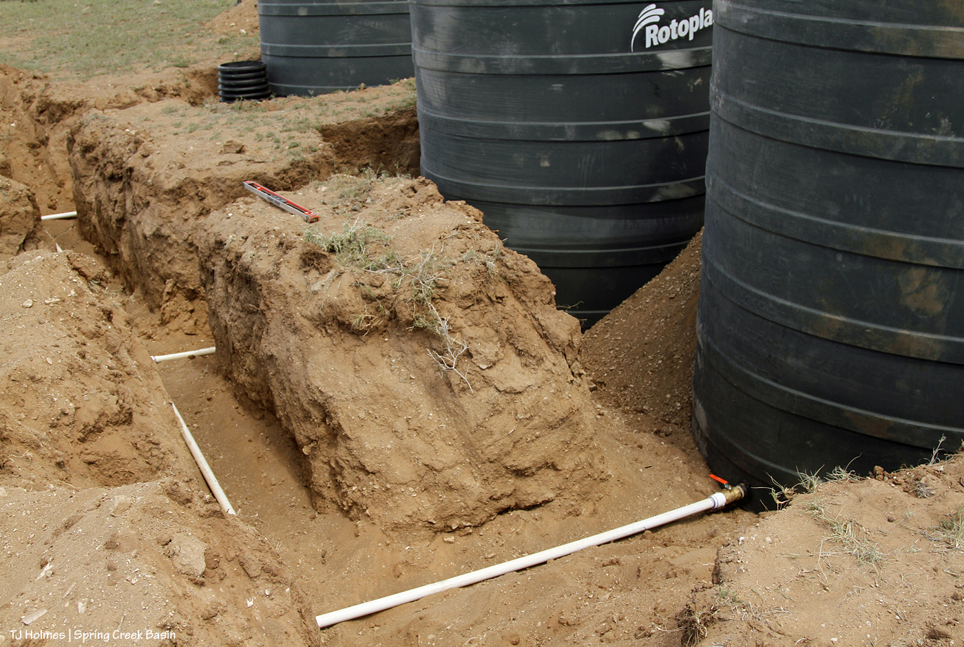This was the last day of work a couple of days ago because – wonder of wonders! – we got nearly a full day of drizzle that Friday. To catch you up, the tanks are now installed, and the trenches mostly dug, so the guys put together the pipes from the tanks to a main line, then connected that line to a line down to the location where the trough will be located.