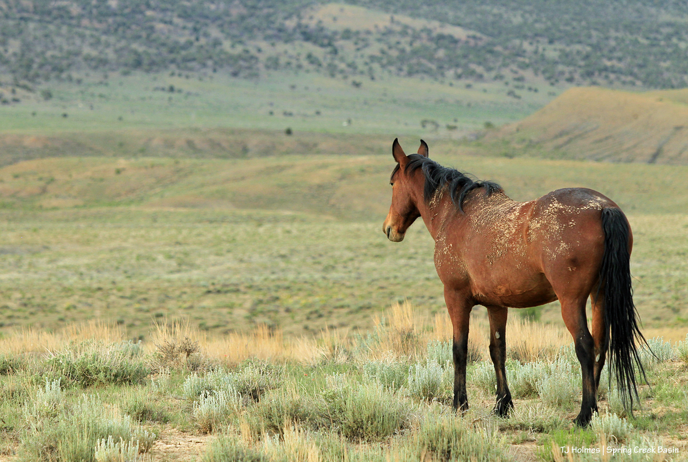 Madison stops to check the wide, far range as her family moseys on in their grazing. She seems to be looking at a couple of bands in wildcat valley (can you see the one band by the very visible white dot in the yonder distance?).