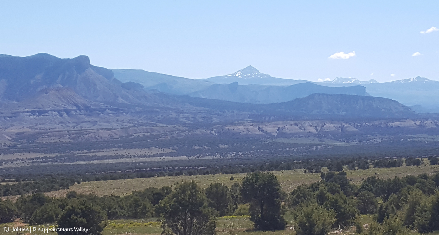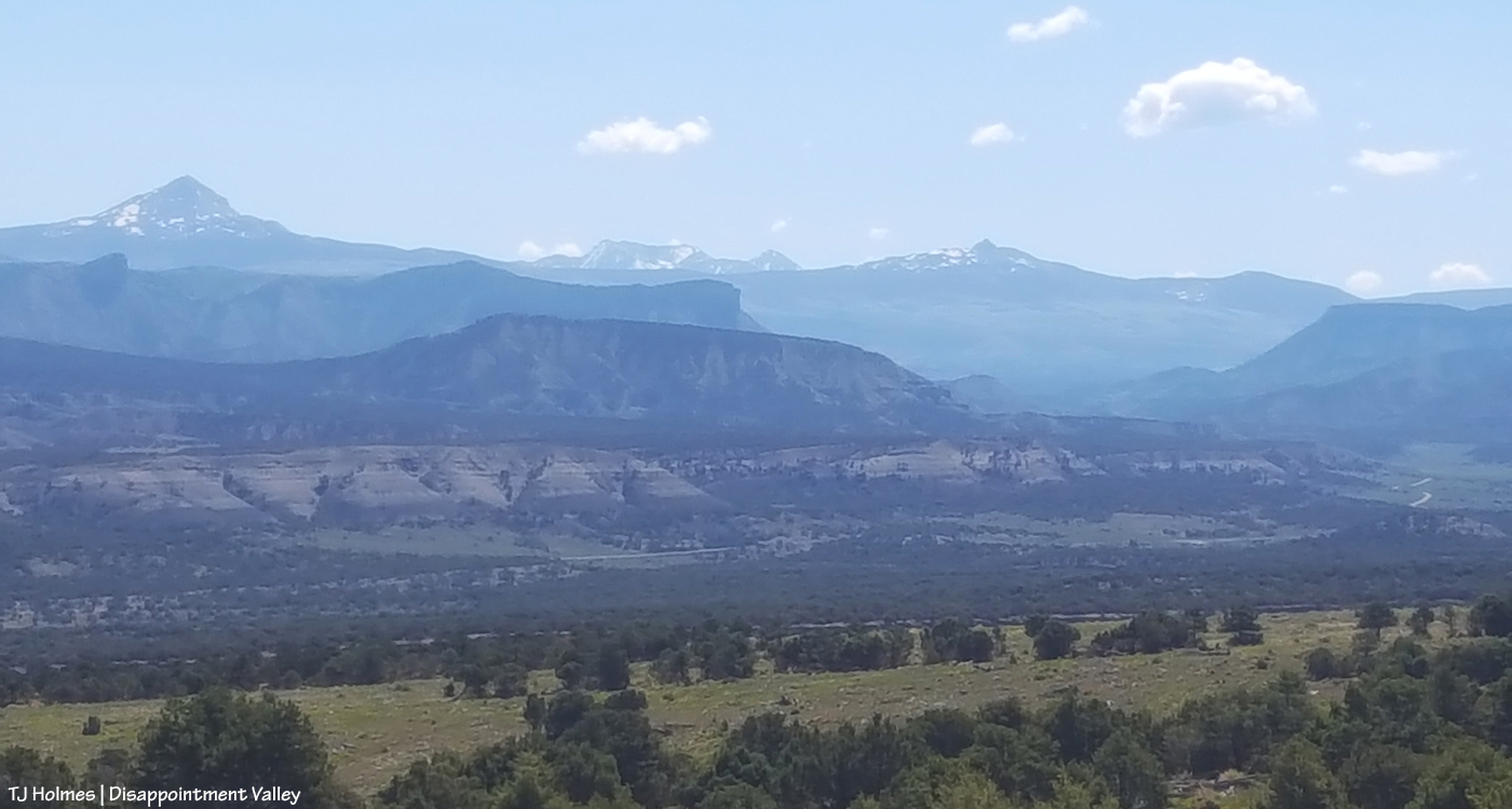 From high on the south side of Disappointment Valley, this is part of the amazing view looking eastish. Lone Cone is the prominent lone (!) peak in the far center background. Brumley Point and Temple Butte are visible at left.