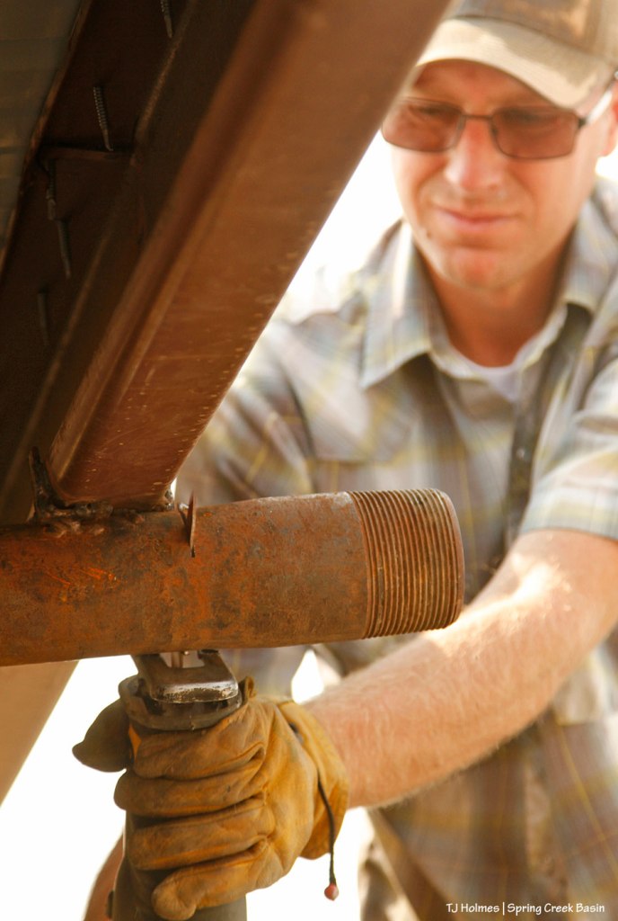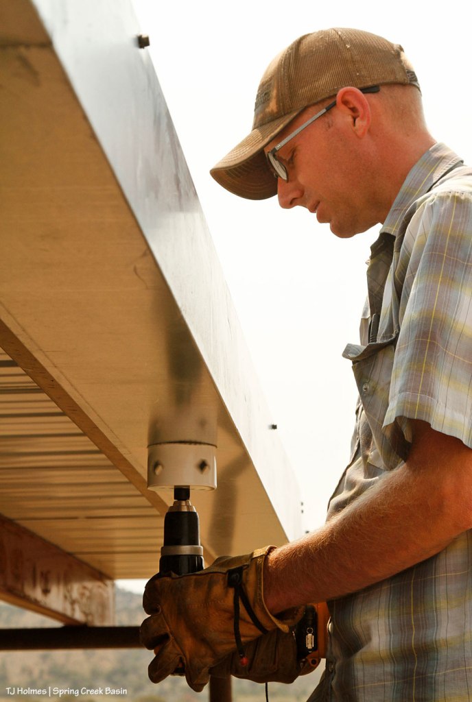The ends of the pipes supporting the whole structure had to be cut a bit to make room for the gutter pieces, which were built/formed/constructed by a local business in Cortez. The guys did NOT bring that cool battery-powered band saw with which they were all completely in love, so Jim (pictured) and Garth had to make do with the ol’ sawzall. It worked; it just took longer (and went through a few blades).