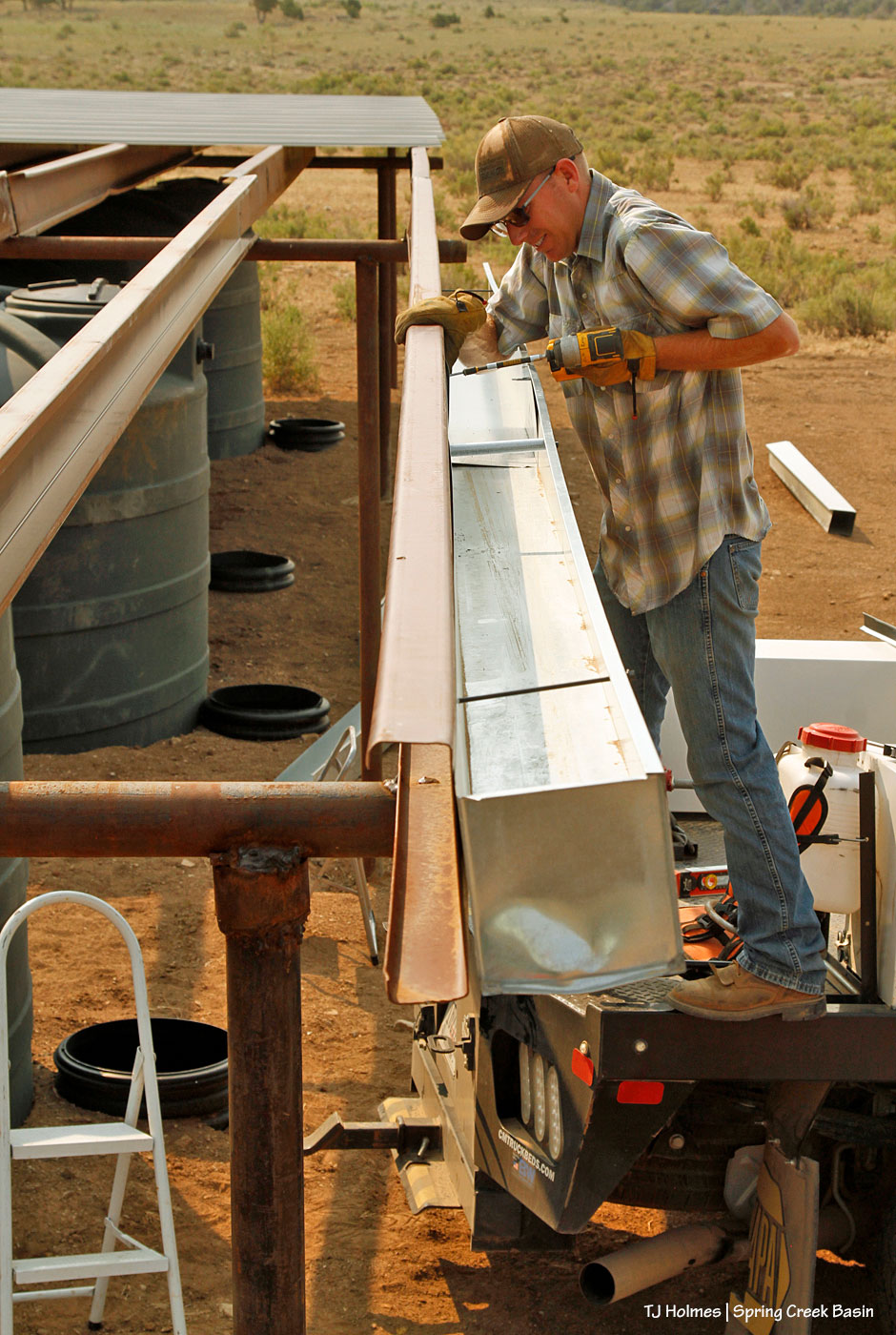 Then … things got really exciting. Jim drove out to the basin in his weed-spraying rig, which has the 200-gallon water tank on it. When the gutter was in place and the pipes were installed, he pulled up alongside the eastern end of the structure and started pumping water up to the top of the roof.