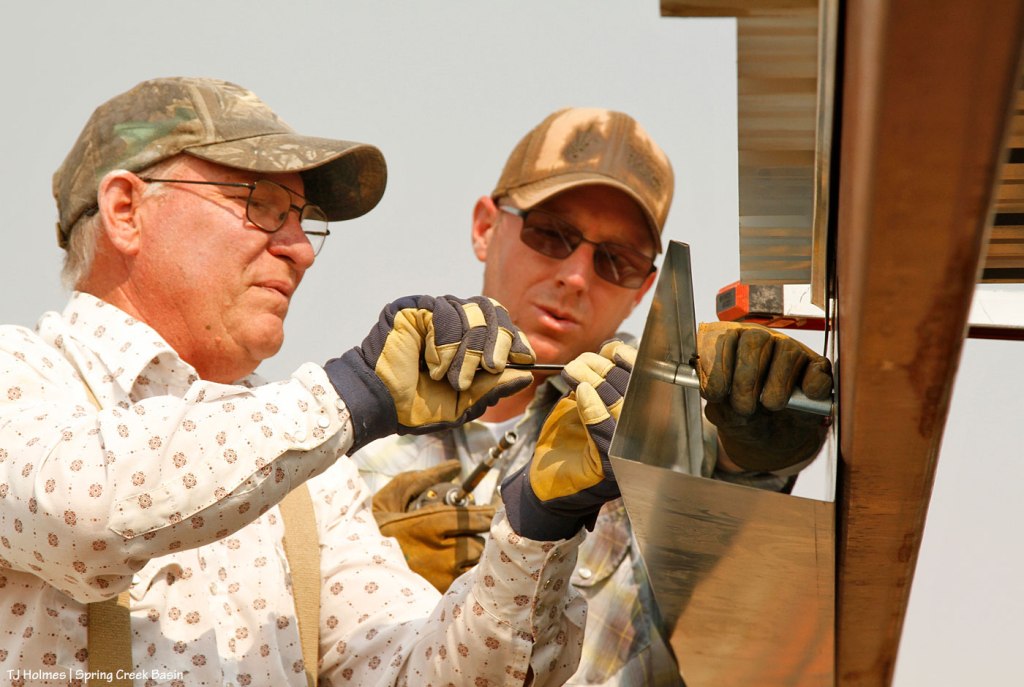 Jim and Garth drilled holes at intervals in order to then run long screws to attach the gutters to the steel purlins.
