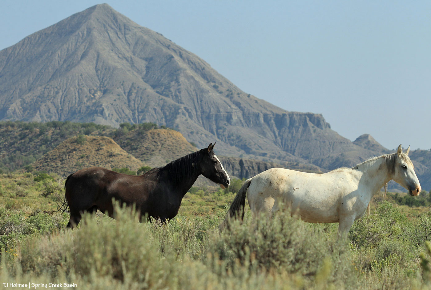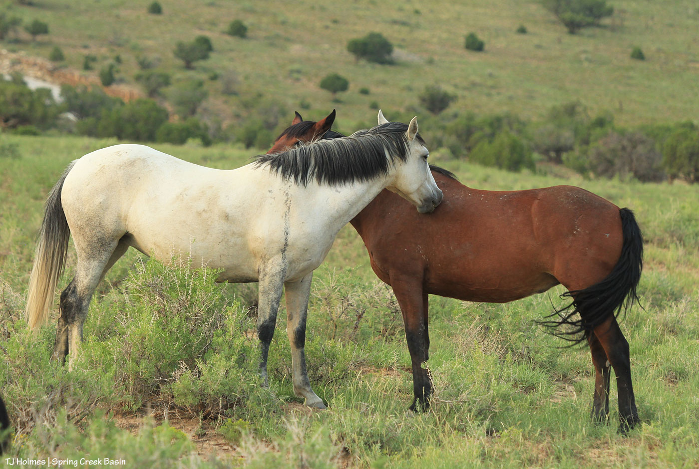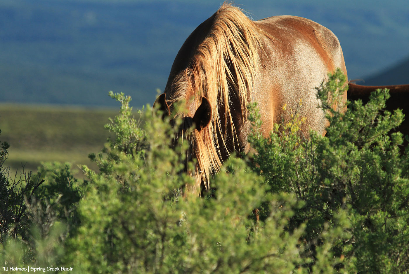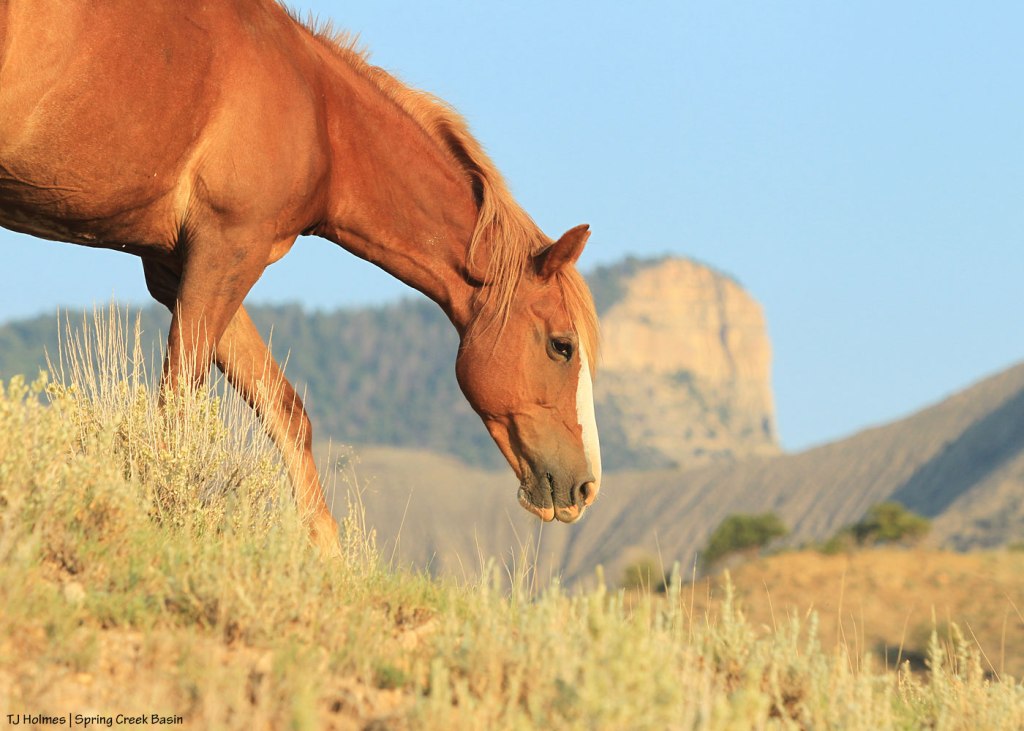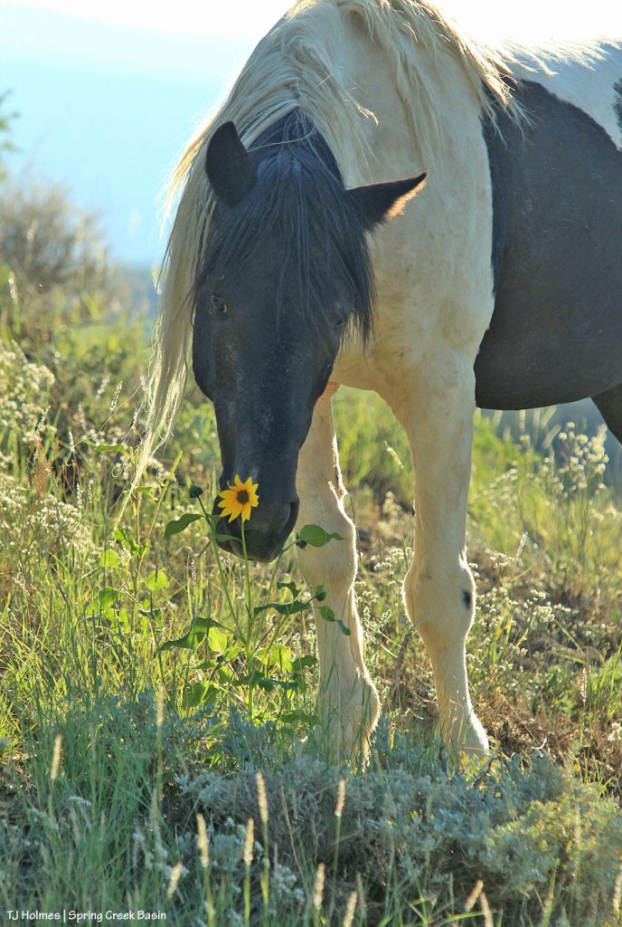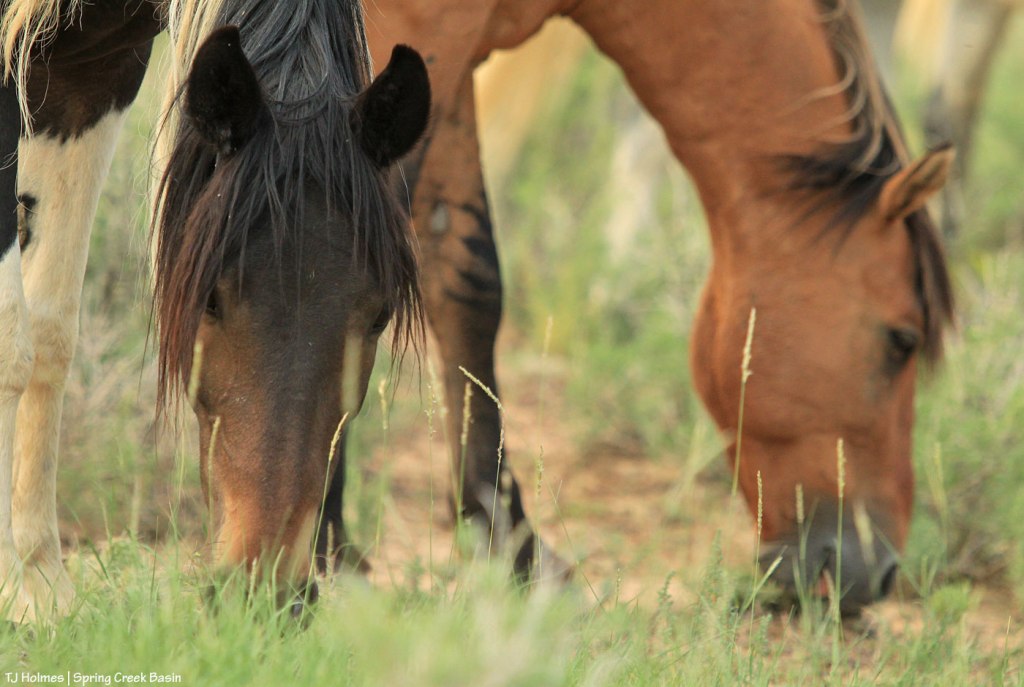 It doesn’t get much better than sitting in a wild expanse on a summer evening, surrounded by horses, listening to the squeak of grasses being snipped and chewed. Spirit keeps a close eye on me while she grazes next to Hollywood. (Check out his leg stripes!)