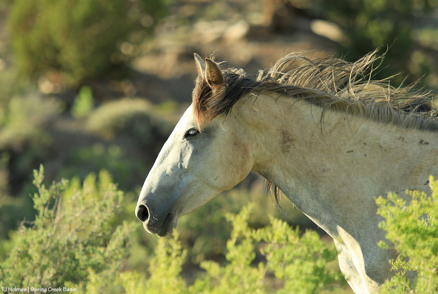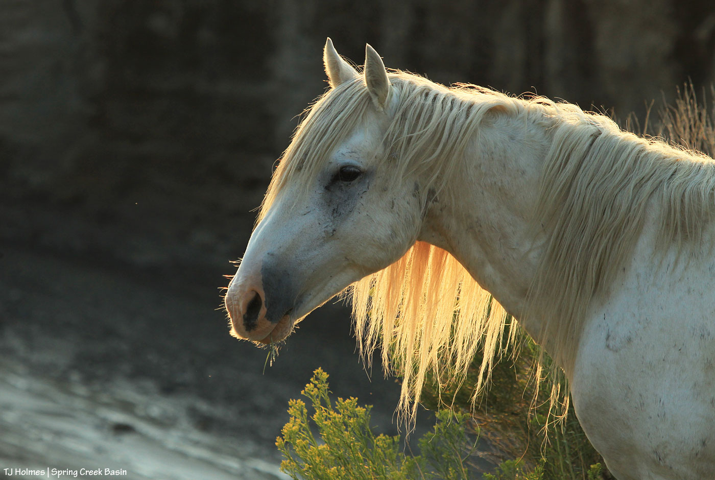 Another one of Sundance, with his brilliant mane aglow against the dark wall of Spring Creek arroyo in the far eastern part of Spring Creek Basin. Really, it’s impossible to imagine “too much Sundance.”