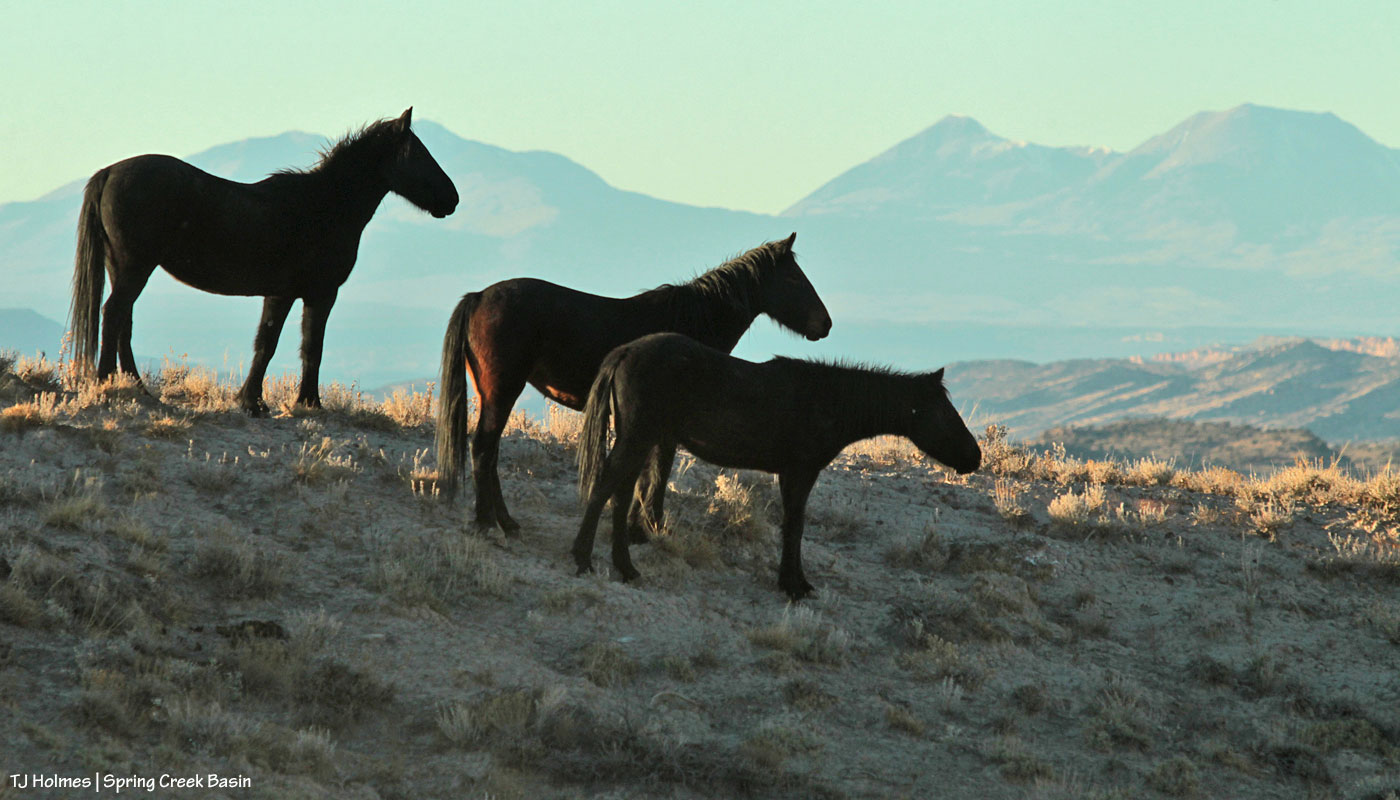 Dark ponies watch a scuffle between their stallion and another band down the ridge and across a seepy arroyo.