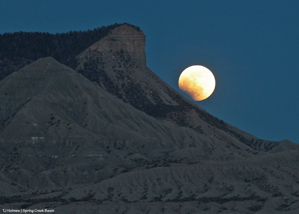The full moon rises last night from beyond McKenna Peak and Temple Butte … already in the first phase of its lunar eclipse.