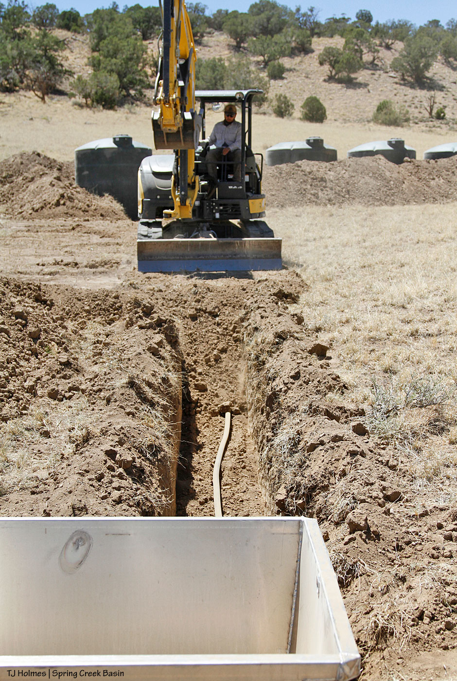 We got the trough set and piped/connected, and here, Daniel is covering the line and part of the trench while Mike stands by to do some shovel work. Today, we’ll set another length of culvert over the valve just barely visible and attach that flexible line to the tanks above.