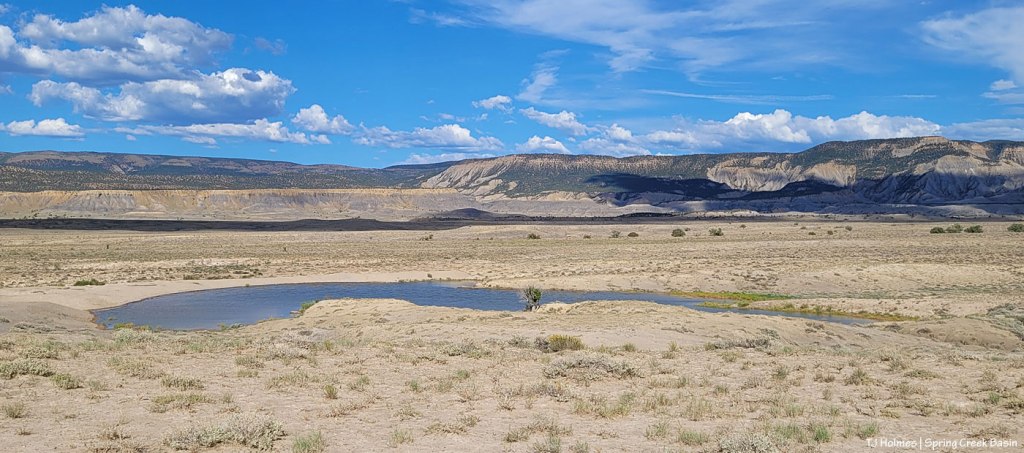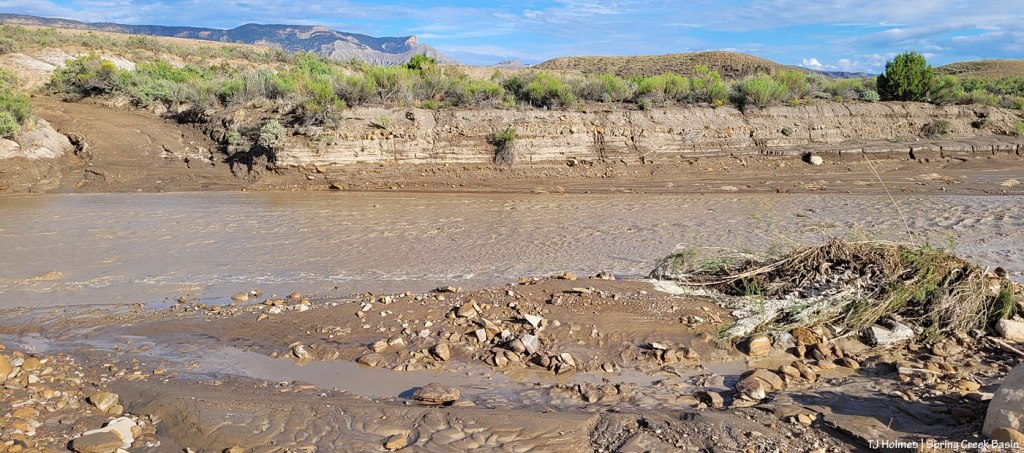 Two perspectives of Spring Creek, flowing with rainwater, the day before yesterday. The first image is directly as the road crosses the creekbed/arroyo; the second is just to the right – water flowing toward us. Interestingly, the road was dry to this point, but clearly it had rained in the northern and eastern (at least) regions of Spring Creek Basin. By this point, the major arroyos of the basin have converged (though there are still some that feed the creek’s westward drainage). The water was neither high (deep) nor terribly fast, but I didn’t cross. There are times to respect Mother Nature’s obstacles, and I deemed this to be one of those times.