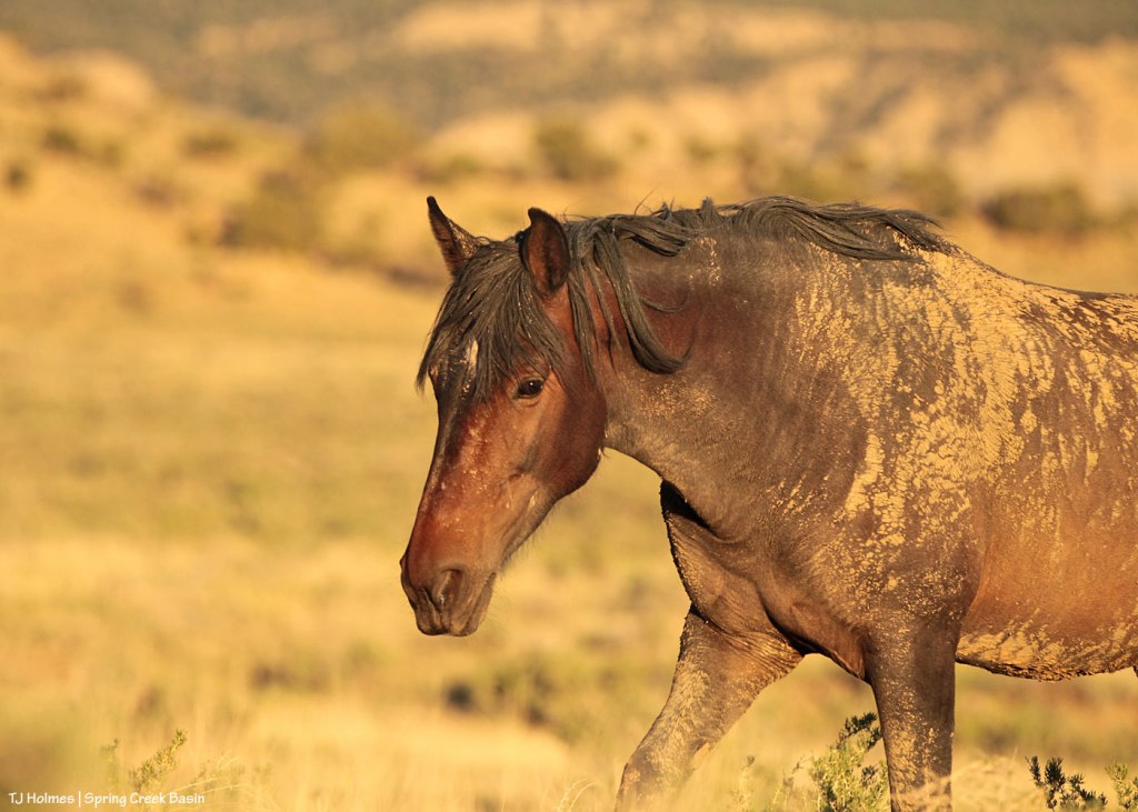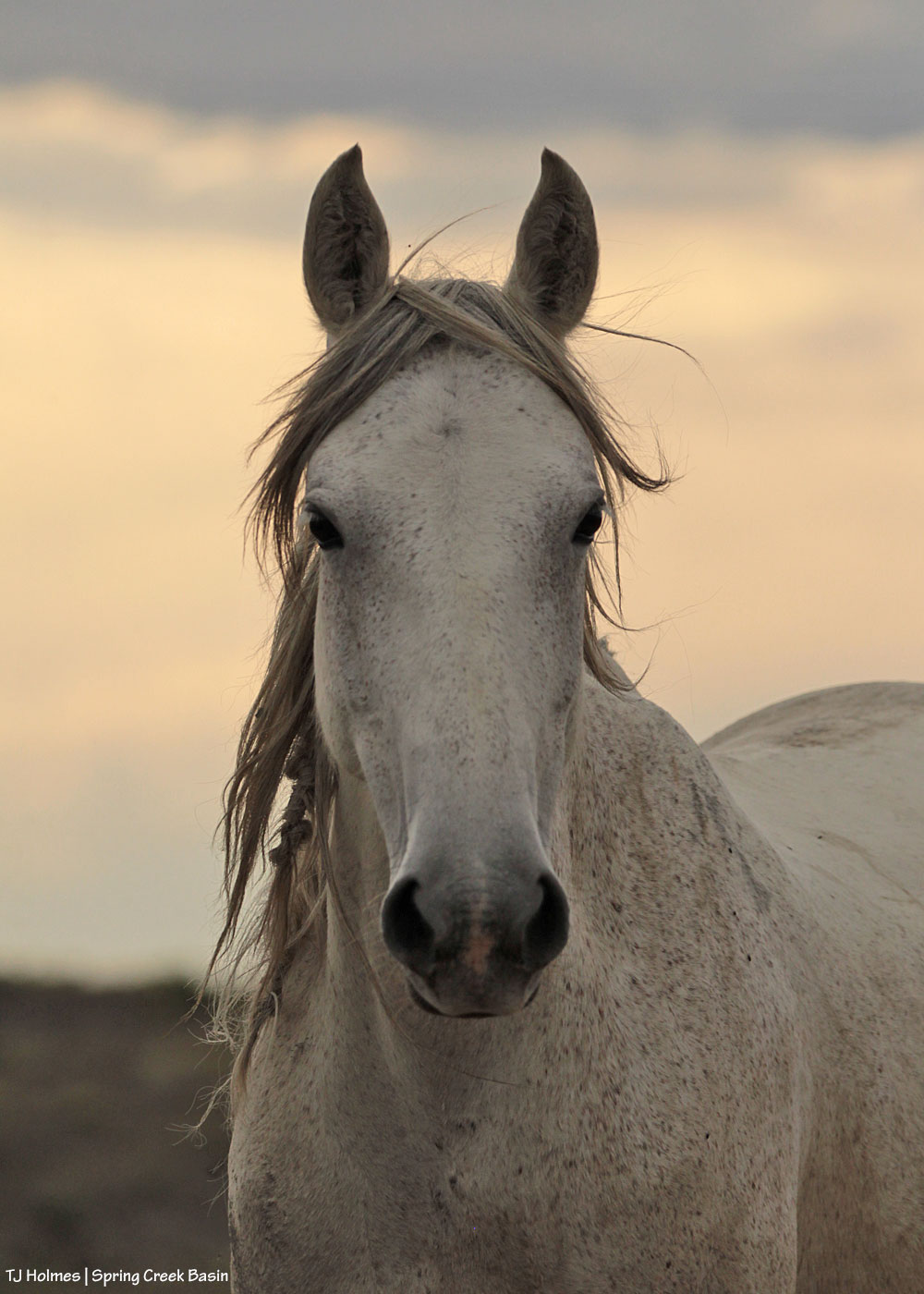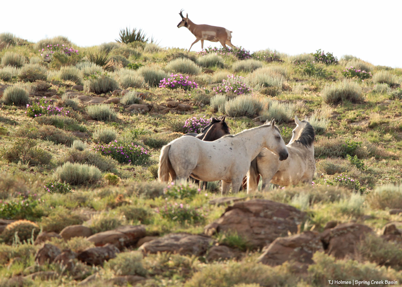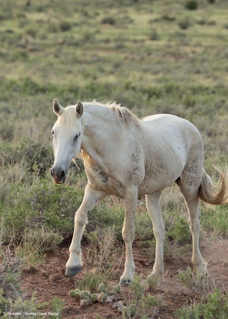 Strength and grace and beauty all in one lovely form. Pretty Alegre follows a faint trail to cross a deep arroyo along the way to water. On they went … and by sunset, they were on their way back to that delicious grass.
