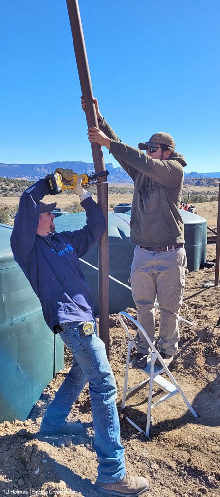 Once we got out to the site, the guys used the laser level to start measuring the heights of the steel pipes to ensure they would level length-wise (across the hill) and sloping width-wise (down the hill). We all converged to mark them by laser level, string and tape-measure methods at the appropriate heights, then Daniel Chavez (front right) and Garth Nelson (on the step stool) started cutting while Mike Jensen (left) and I stood by to help. … But shortly, they realized there was a problem with the nifty cutting tool that Garth is using in the pic above: The blade wasn’t really getting the job done. And I’ll be the first to tell you that THAT tool is one of their favorite tools for the *usual* ease with which it cuts through that heavy steel pipe.