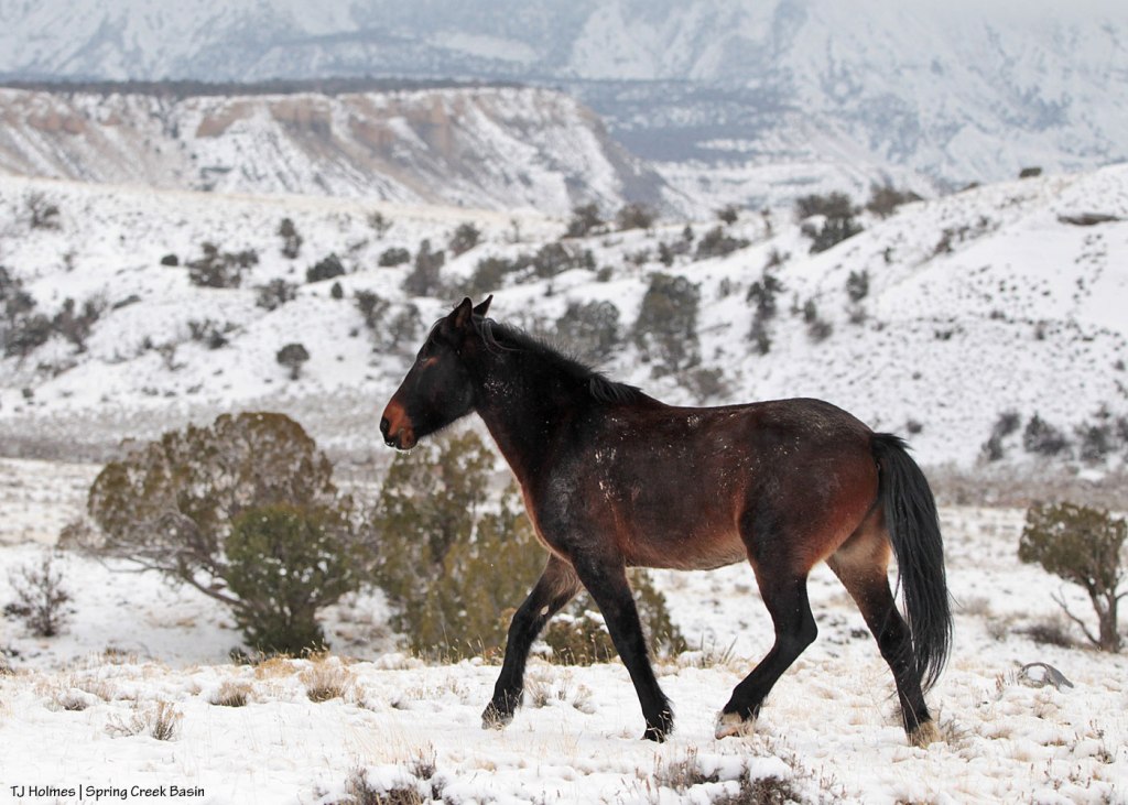 Tenaz (showing off his rarely-seen generous star with wind whipping aside his forelock) and the mustangs rang in the first day of 2022 with fresh snow! A handsome bay mustang does look rich and supremely healthy in new snow. I know I write that a lot with regard to bay mustangs, but really, have you ever seen a better color combination!? OK, OK … all of the other equine colors look pretty fabulous, too. 🙂