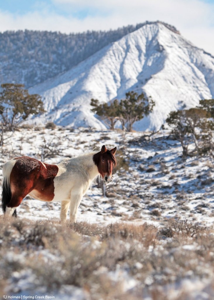 For some reason, a pinto mustang pony always stands out beautifully in the snow-covered landscape. Miss Chipeta wasn’t really feeling her modeling session, but in keeping an eye on me, lounging in the snow, a beautiful model was she, indeed!