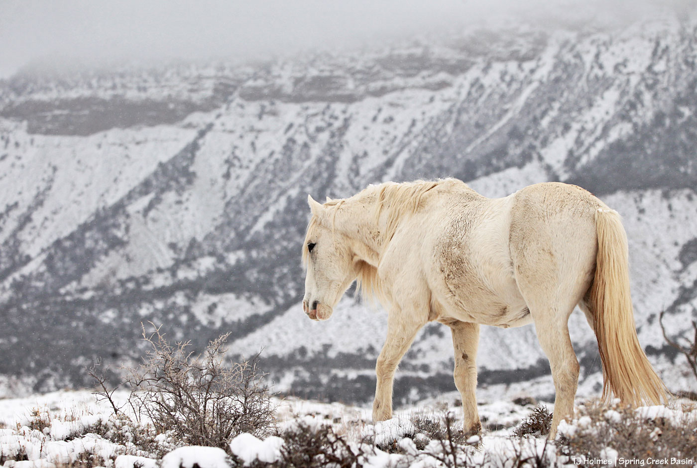 The mustangs were tucked into sheltered places again, apparently, because I saw a couple of lone bachelors and only two bands. Fortunately, one of those bands was Sundance’s, and he’s always up for a bit of modeling work. πŸ™‚ That said, it’s hard to tell the story of falling snow with a grey mustang! If you click on the pic to enlarge it, you might be able to zoom in and see the tiny little snowflakes that show a bit better against the far northeast east-pocket ridge.
