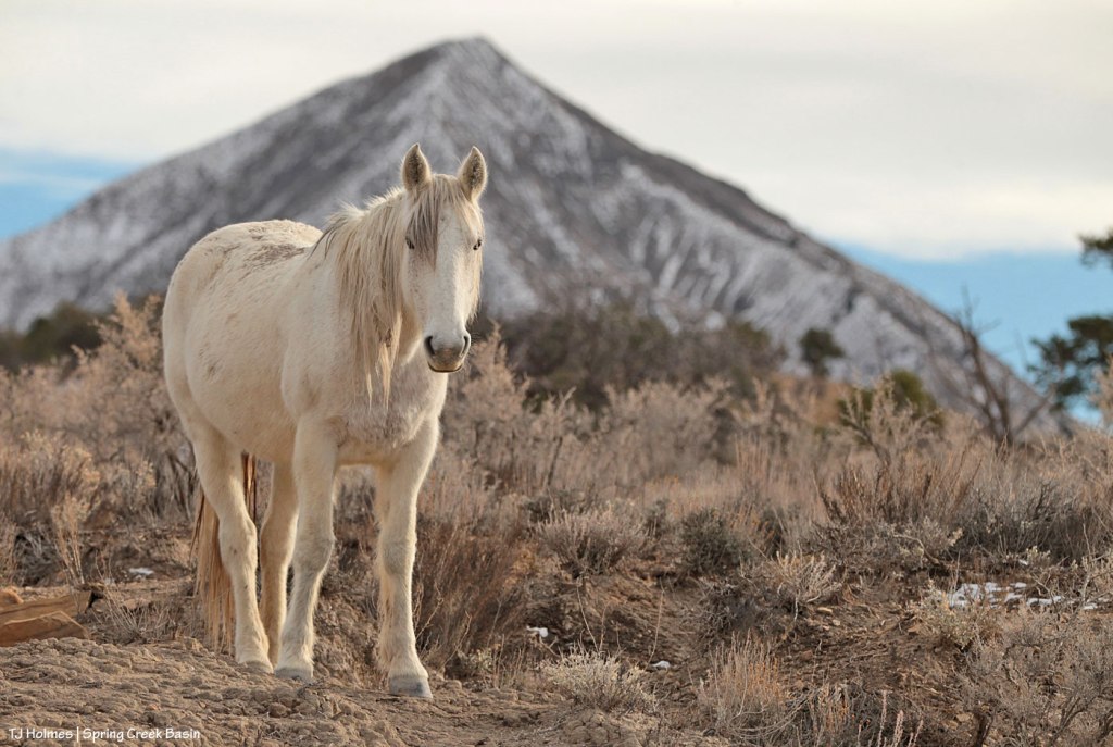 Hollywood is usually one of the specific horses I look for in Spring Creek Basin to help show off the white goodness when we get snow because his color is so RICH and divine. The clouds had come over by the time I found him and his family, but he still stands out like a particularly bright spot in an otherwise mostly-monochrome landscape. He may not have the “beard” some of the horses grow in winter, but you can see how wonderfully thick is his velvet coat!