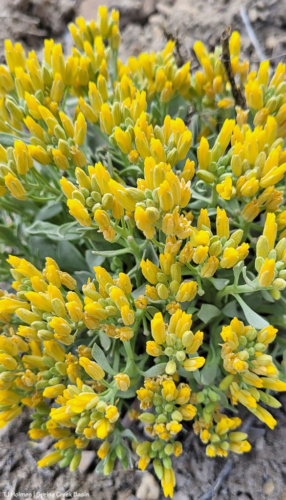 These little yellow flowers are coming up now in Spring Creek Basin. The petals are closed here, but my handy-dandy new plant/flower identifier app on my phone says it’s called “Chambers’ twinpod.” This gets a 77% chance of correct ID.
