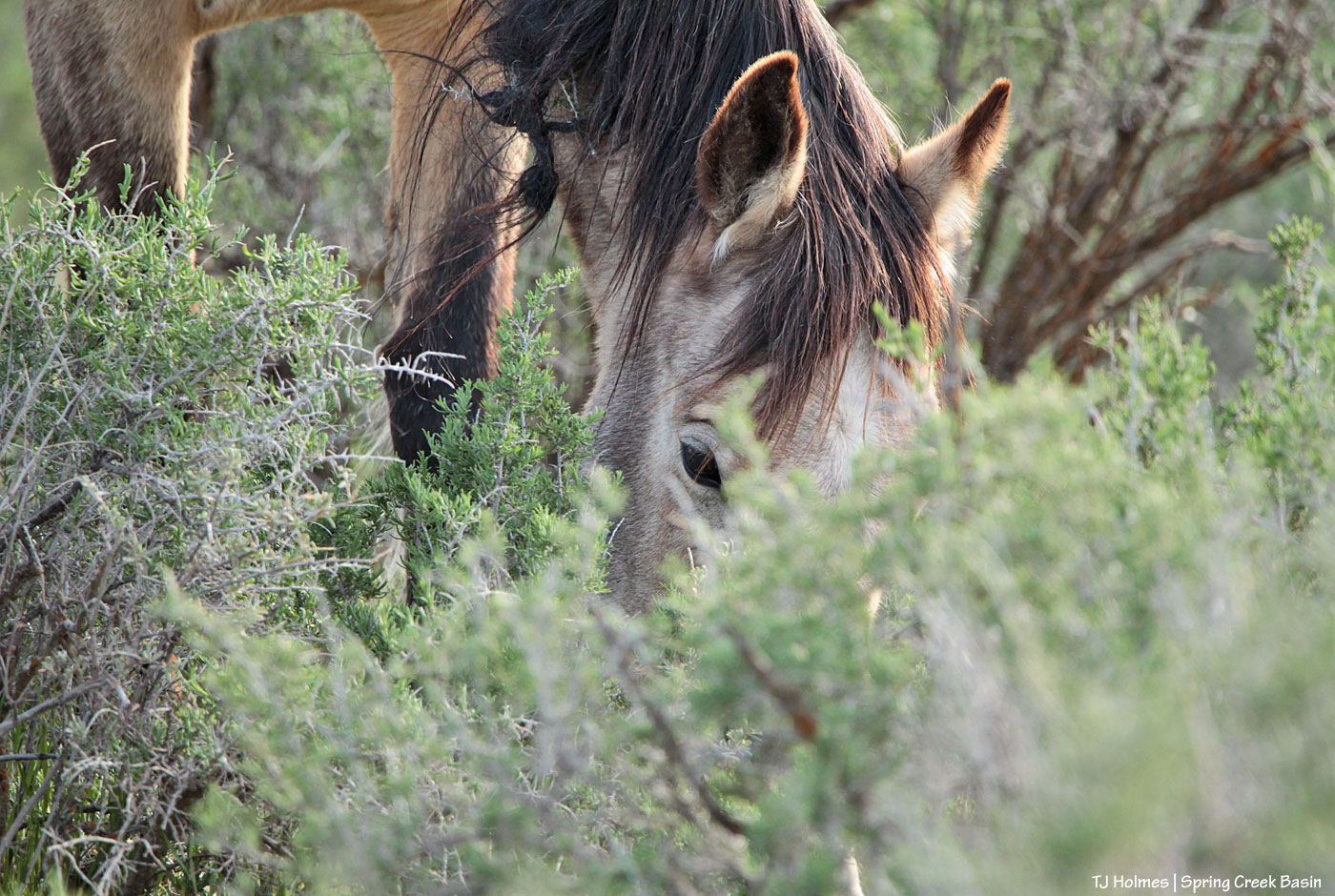 Kestrel gives me an eyeball while she searches for fresh, yummy, actual grass around the bases of the green greasewood on a bench just above one of Spring Creek Basin’s main arroyos. The horses definitely eat the greasewood, but at this particular time while I was with them, they were all about that grass, which was a few inches tall where sheltered by the woody stems of the greasewood. It must have been satisfying for *them* to eat … *listening* to them snip the bunches of grass with their teeth and chew was incredibly satisfying for *me*! π