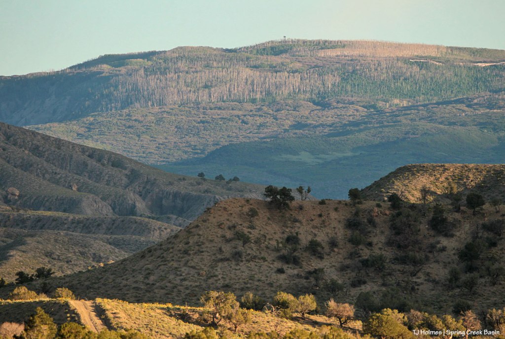 A few weeks ago, I got a message from Rick Freimuth, who is a firewatcher based at Benchmark Lookout in the San Juan National Forest. He shared with me a glorious sunset pic he had posted recently from the tower and said that just a little outside the frame of the photo was Disappointment Valley – and Spring Creek Basin. As it turned out, I had recently taken a pic in which I included the ridgeline on which the lookout tower stands, so I sent it to him in turn.