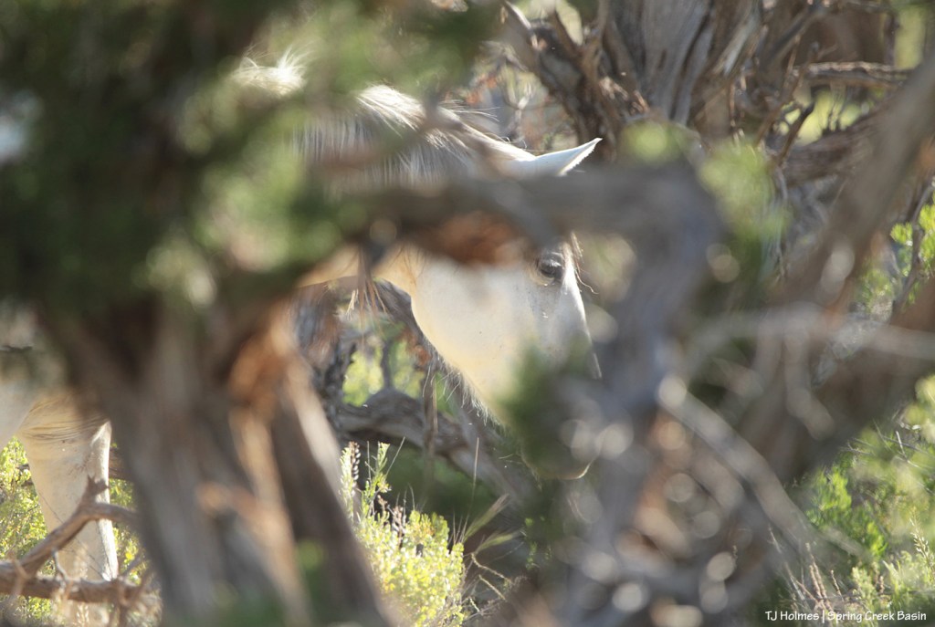 Sly Winona thinks she’s hidden as she glides softly through a pocket of trees on the edge of a big “meadow” area. Even as she moseyed out into the sunshine to graze, her stallion moved to mosey her back to the shade. I think his meaning was clear: Hey, take a rest in the shade!