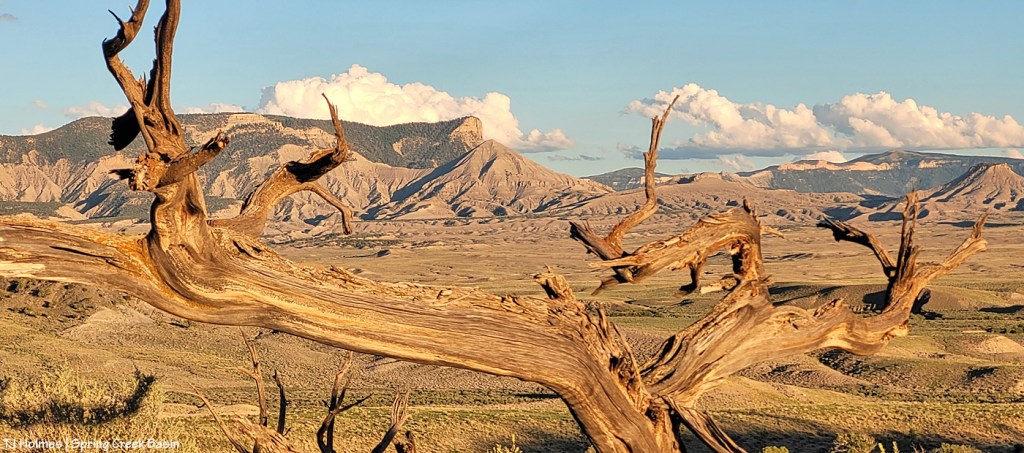 This wonderful sculpture of an old juniper just begged to be used as a frame for this view of the basin, looking southeast. Note the grey mustang at lower right; she was grazing with her band and two others just below the height of the bowl. Visible across the background are landmarks often to irregularly featured in other images posted on the blog: Temple Butte above McKenna Peak (framed right through the upper part of the old tree), submarine ridge, Brumley Point (just right of the farthest top-right branch), Round Top and Flat Top. The snaking shadow-line at mid-right, above the mustang, is a low ridge along the south bank of Spring Creek. The canyon is downstream, farther right and out of this frame.