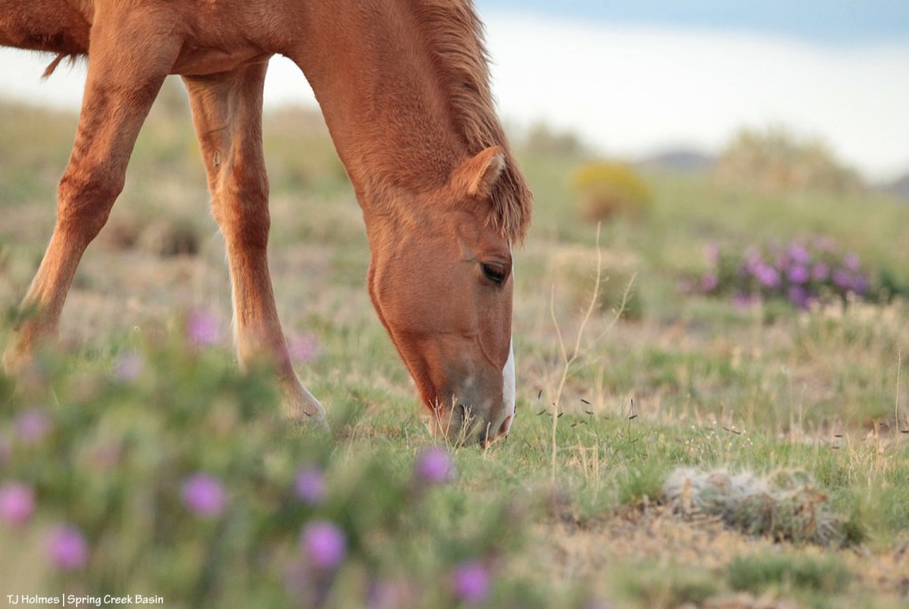 We don’t have lupine (my favorite wildflowers … among many favorites (!)) on our range, but we do have four o’clock, which are nearly (!) as wonderful. And as everywhere, it’s always a treat to catch a foal among the wildflowers. 🙂