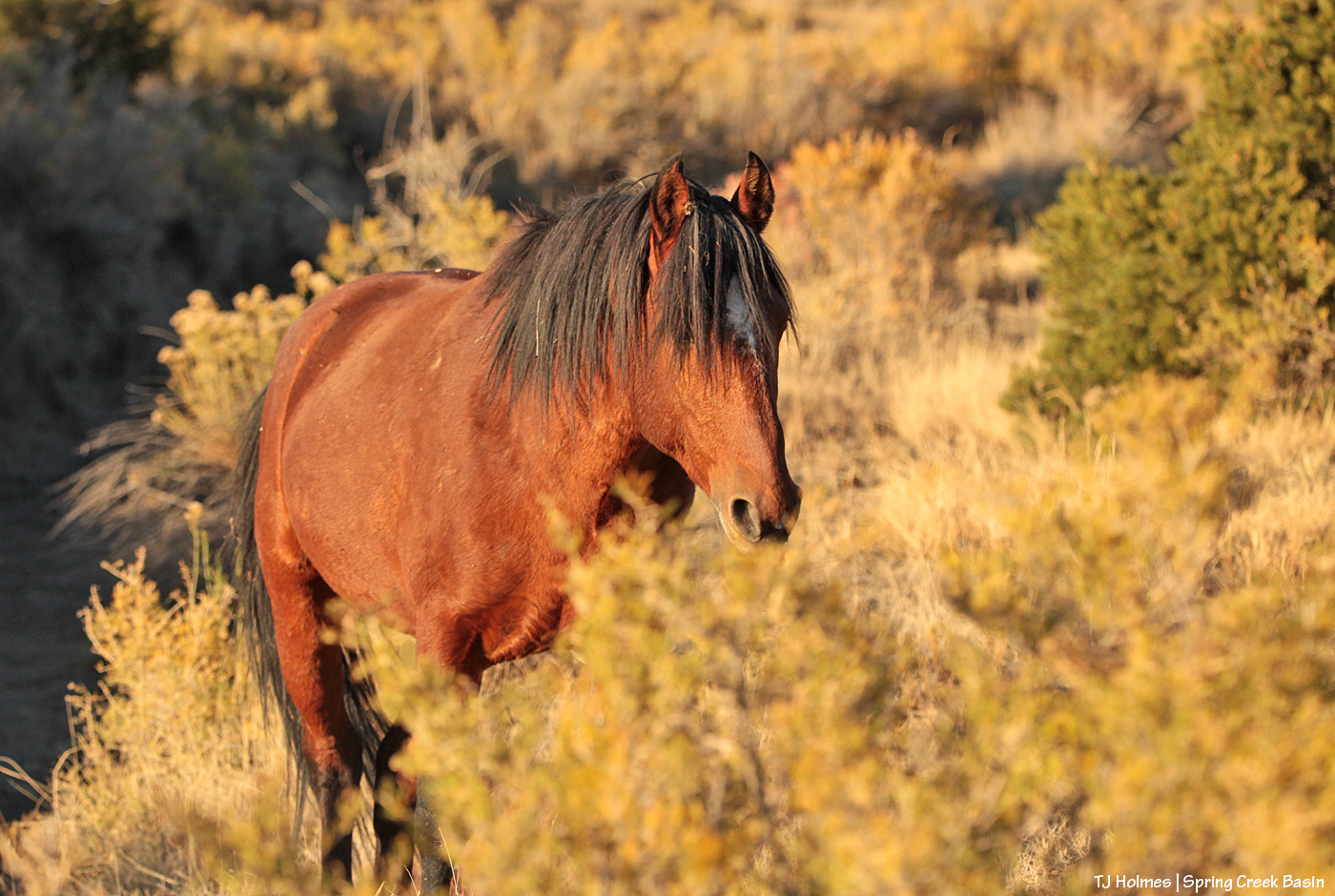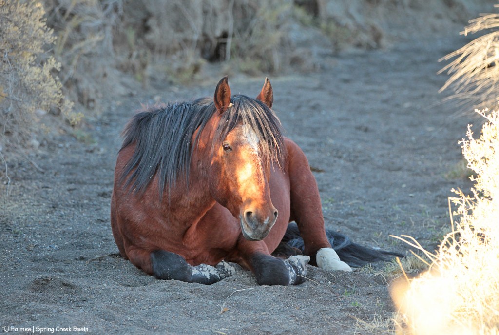 A few days ago, Tenaz’s band was napping low in a drainage between a butte and a ridge. As I walked out to them, I could see Temple napping lying down with a couple of her band mates standing over her. A few were grazing, including a couple down in the shallow arroyo through the drainage. I didn’t see Tenaz until I crossed the arroyo slightly “downstream” of him, and then I waited for one of the young mares to mosey out of the arroyo so I could see him lying in what must have been the very comfortable, relatively flat and definitely-not-prickly bottom of the little arroyo. (The vegetation is dry and prickly currently, as opposed to the cool, relatively smooth, dirt bottom of the arroyo bed.)