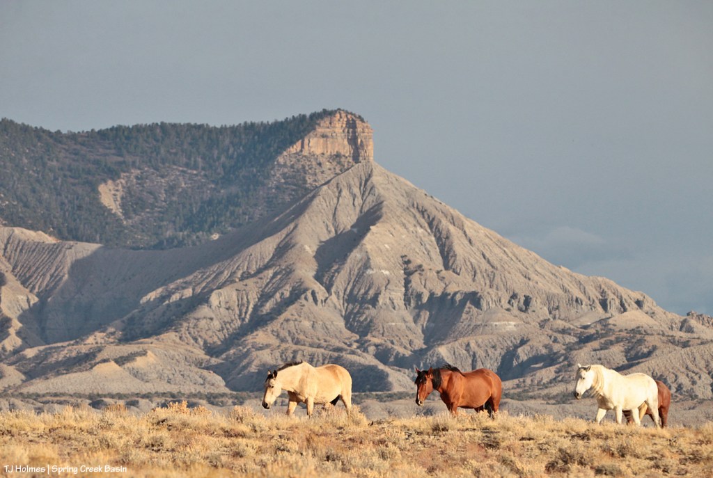 Love those moody blues, modeled so well by Flash. The day had been really smoky/hazy/dusty (?), and the clouds were skimmed high over the sky, so the light had a really interesting quality – not cloudy but definitely not sunny. By the time I took this pic of Flash, against Filly Peak, way in the distance, the sun had set into a low-to-the-horizon cloud bank, and the light was just … bluey. Not grey. Kind of cool. Filly Peak usually is very orangey/taupey/beigey um, tan. The far blue ridge is outside/beyond Spring Creek Basin, and that *blue* is dense pinon-juniper forest.