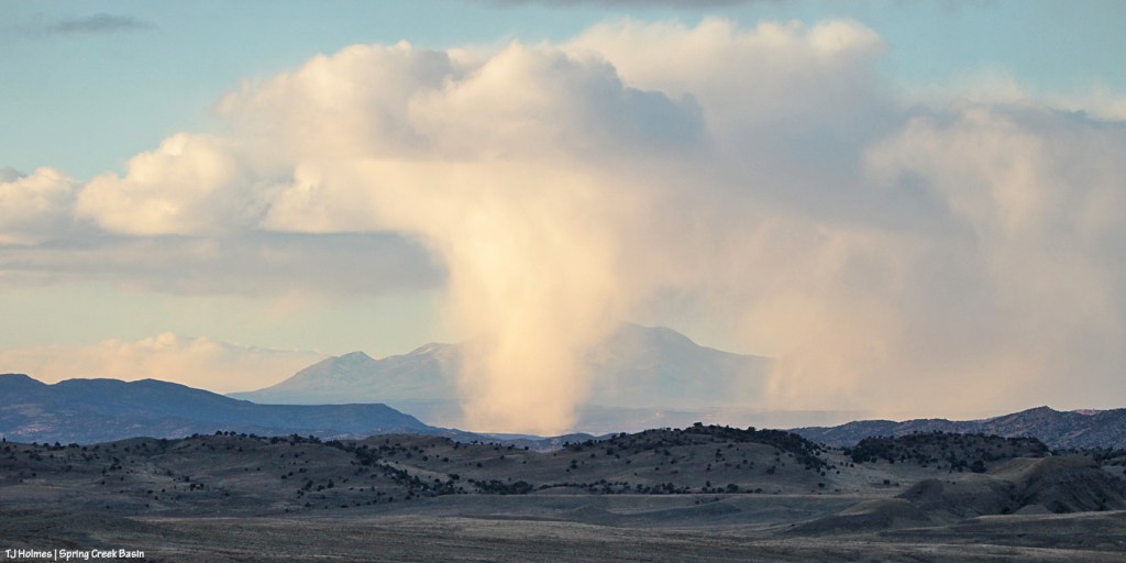 The passing snow squalls were “this side” (eastish) of Utah’s La Sal Mountains.