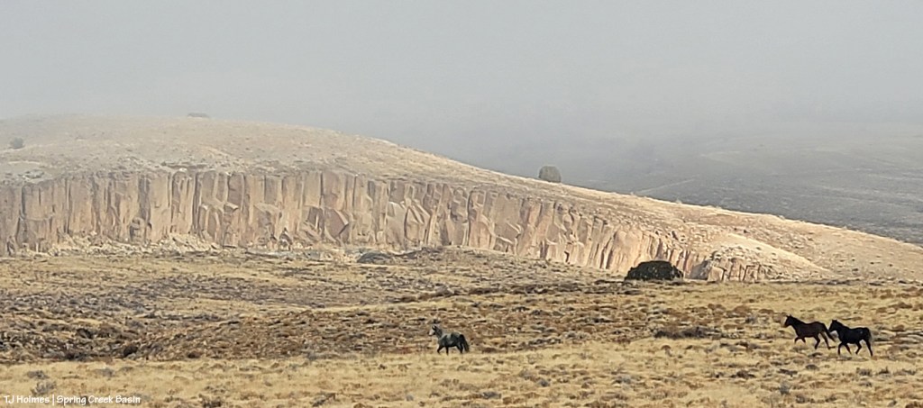 Above, I happened to catch sight of a few bachelor stallions trotting across the landscape, with a hazy spotlight of sunshine casting light particularly on the rimrocks above Spring Creek canyon. Oh, so very pretty.