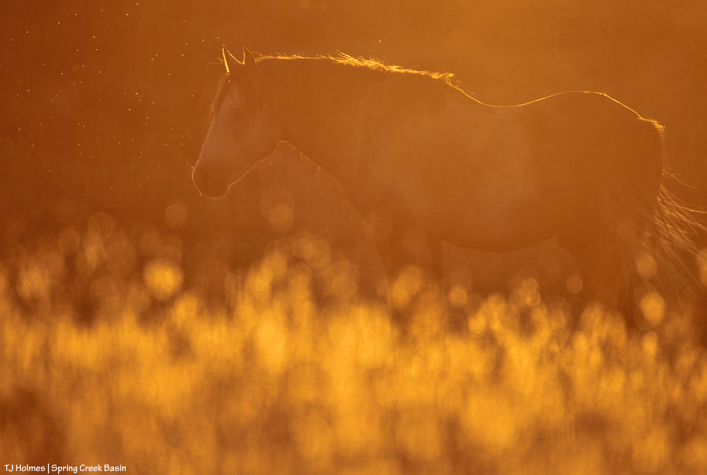 Young stallion Cheveyo was in just the right place at just the right time for the very low sun to highlight him against the far, shadowed, hill and turn the foreground grasses to dancing flames of light. I’ve said it before, but it bears repeating: I adore backlighting!