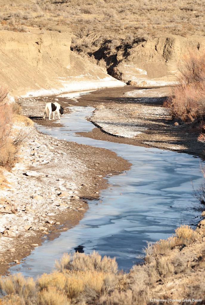 I love this photo, TJ! It just seems to capture the essence of a winter day in Spring Creek Basin – the ice, the alkali deposits, the brown landscape, the mustang at the frozen creek.