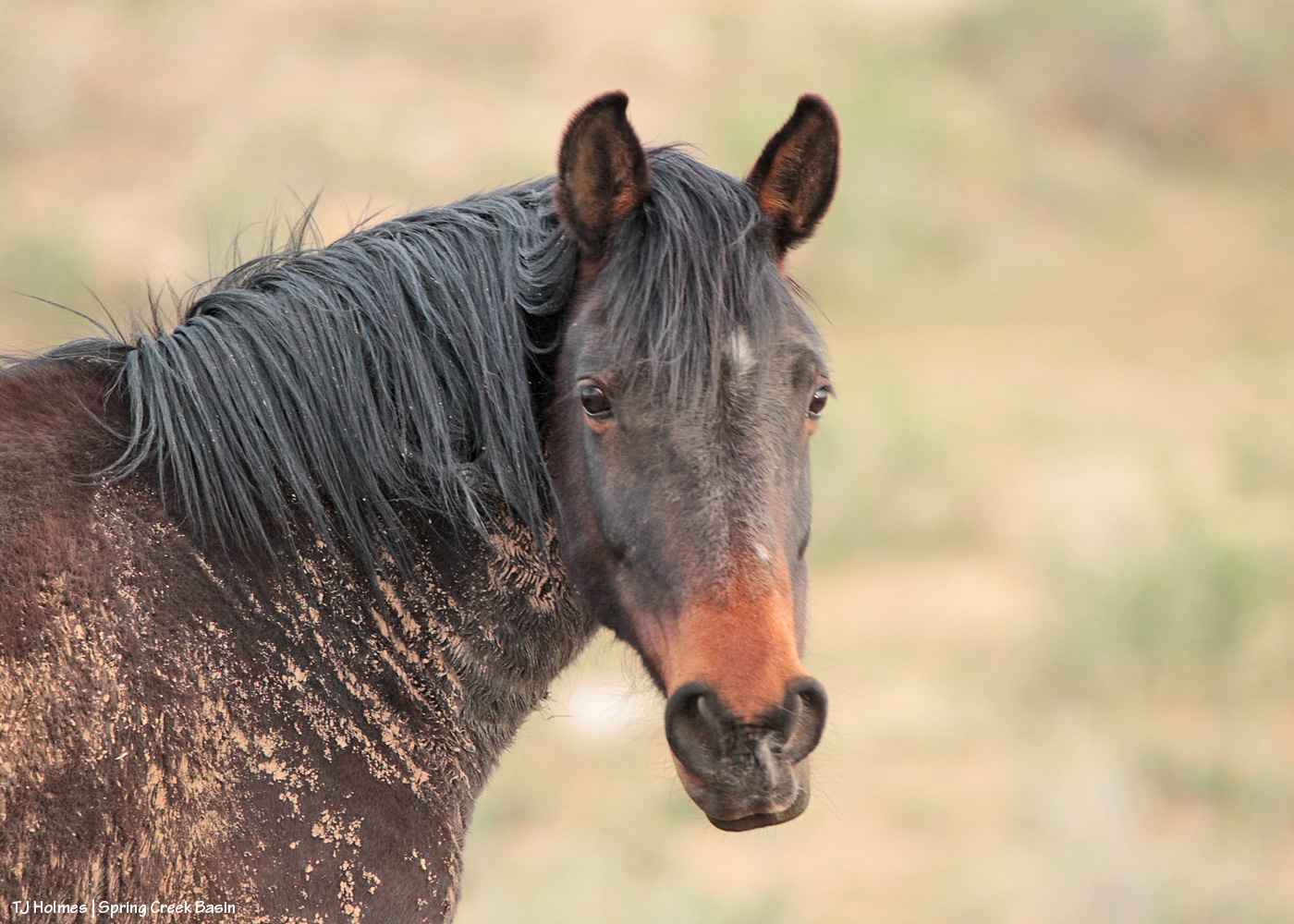 As I was heading out of Spring Creek Basin the other evening, after the sun had set into a low cloud bank, I came upon Cassidy Rain and her band grazing just below the road. She ignored me until I was inching by her in the Jeep … and then she looked up! Fortunately my camera was still out of its pack, and I lifted and eyeballed and hit the shutter. She didn’t stop chewing while she eyeballed me back, and I got a couple of fairly decent portraits of the muddy girl.