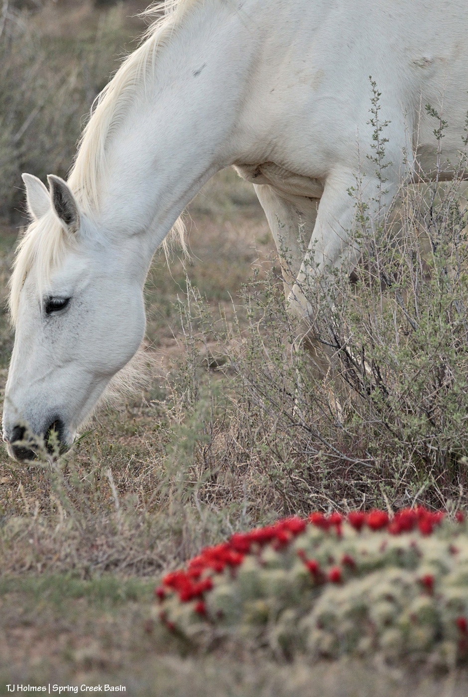 This giant claret cup cactus (or cacti in a bundle?!) was amazing, and I tried to get various horses in the same frame with it without success. Alegre wasn’t suuuuuper cooperative in that way, but I managed to get her as she grazed her way from behind a four-wing saltbush – without shaving off part of her face. 🙂