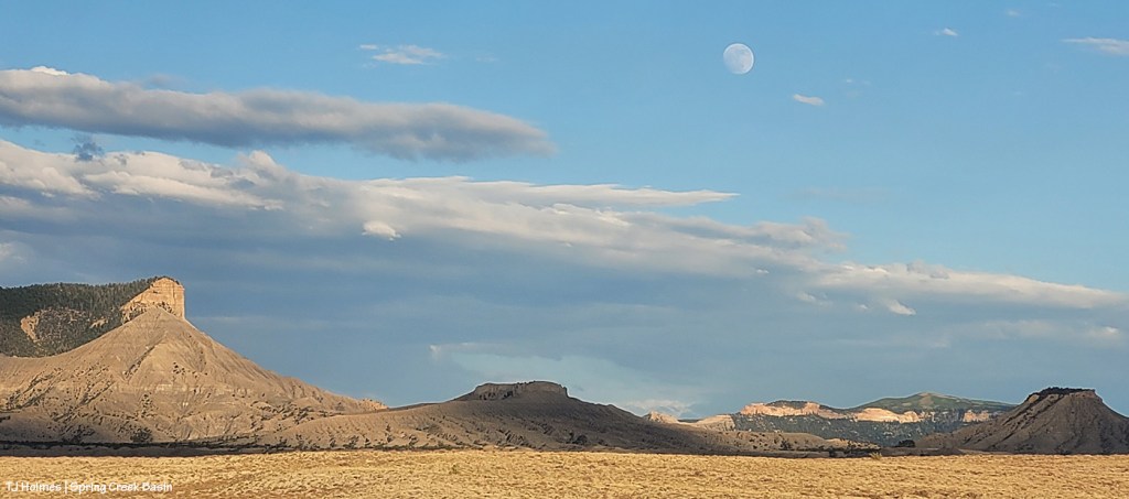 The pic of the nearly-full moon rising over Spring Creek Basin landmarks McKenna Peak, Temple Butte, submarine ridge and Brumley Point was taken last night.