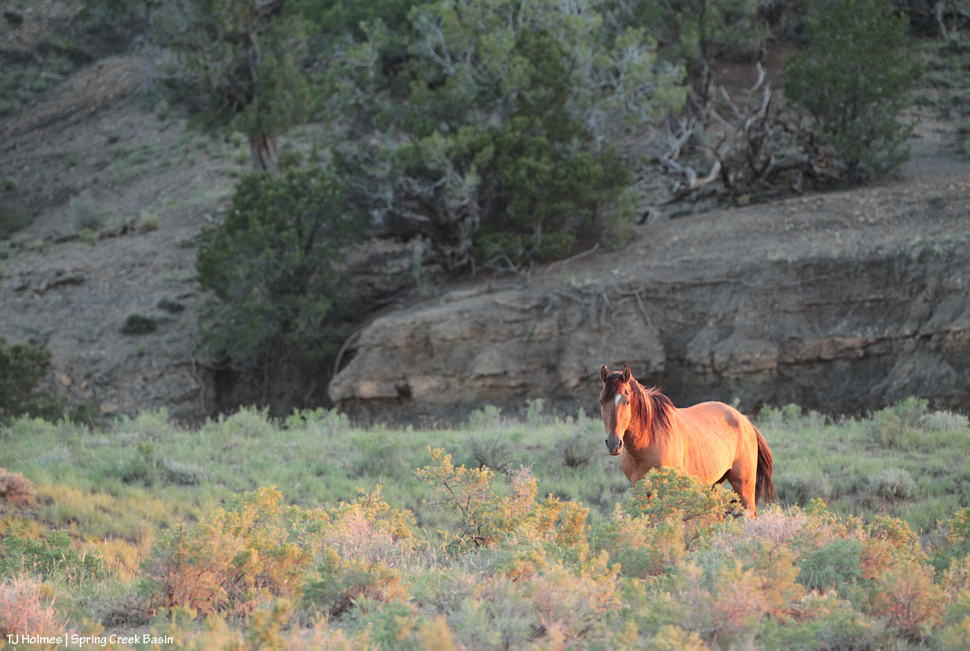 He looks better than he did a month or more ago, so that’s a good sign. There’s LOTS to eat out there, and the water is fairly plentiful. Sundance has chased him away (and SunD is no spring chicken, either), but I don’t think he’s trying to steal mares or a band – at least he’s not putting a huge effort into it. … Still, old habits and instincts must die hard (or not at all?!). I’m always very glad to see him. I spotted him just last night, with Sundance’s band, from a distance.
