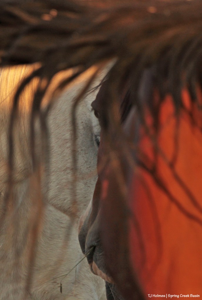 (I’ve heard that formation called Klondike Basin, but as it’s a ridge, outcropping, something (?), it doesn’t look much like a basin. On maps in that area is something called Buck Knob. Which/whatever its name, it’s as identifying to Spring Creek Basin as some of our other landmarks, though because of its location and rarity of catching the horses in proximity, it doesn’t show up in many pix.)