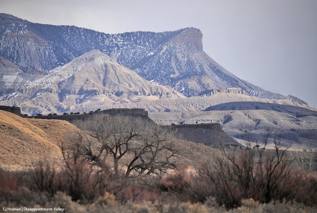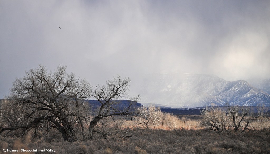 This is yet farther south (from my vantage point, I’m looking sort of southeast-ish). While I was trying to get the snow over the very far (and much higher elevation) ridges, a golden eagle was flying over the scene. See it above the cottonwood at left?