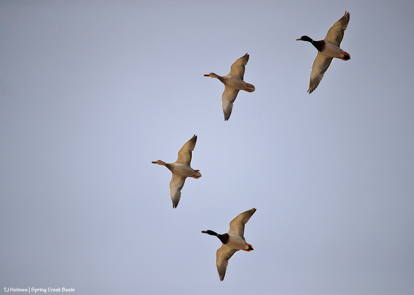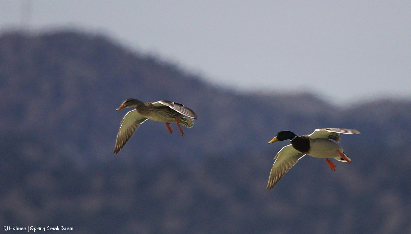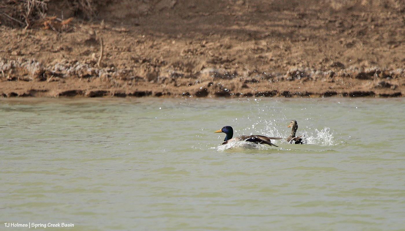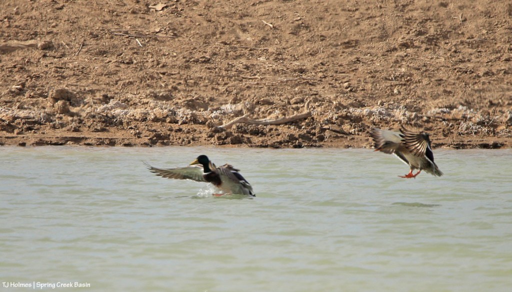 These four mallard ducks (two drakes, two hens) were with another pair on one of two ponds in Spring Creek Basin that currently have water (which is in itself something special, given our dry conditions). They took off when I approached … and circled … then came back to land.