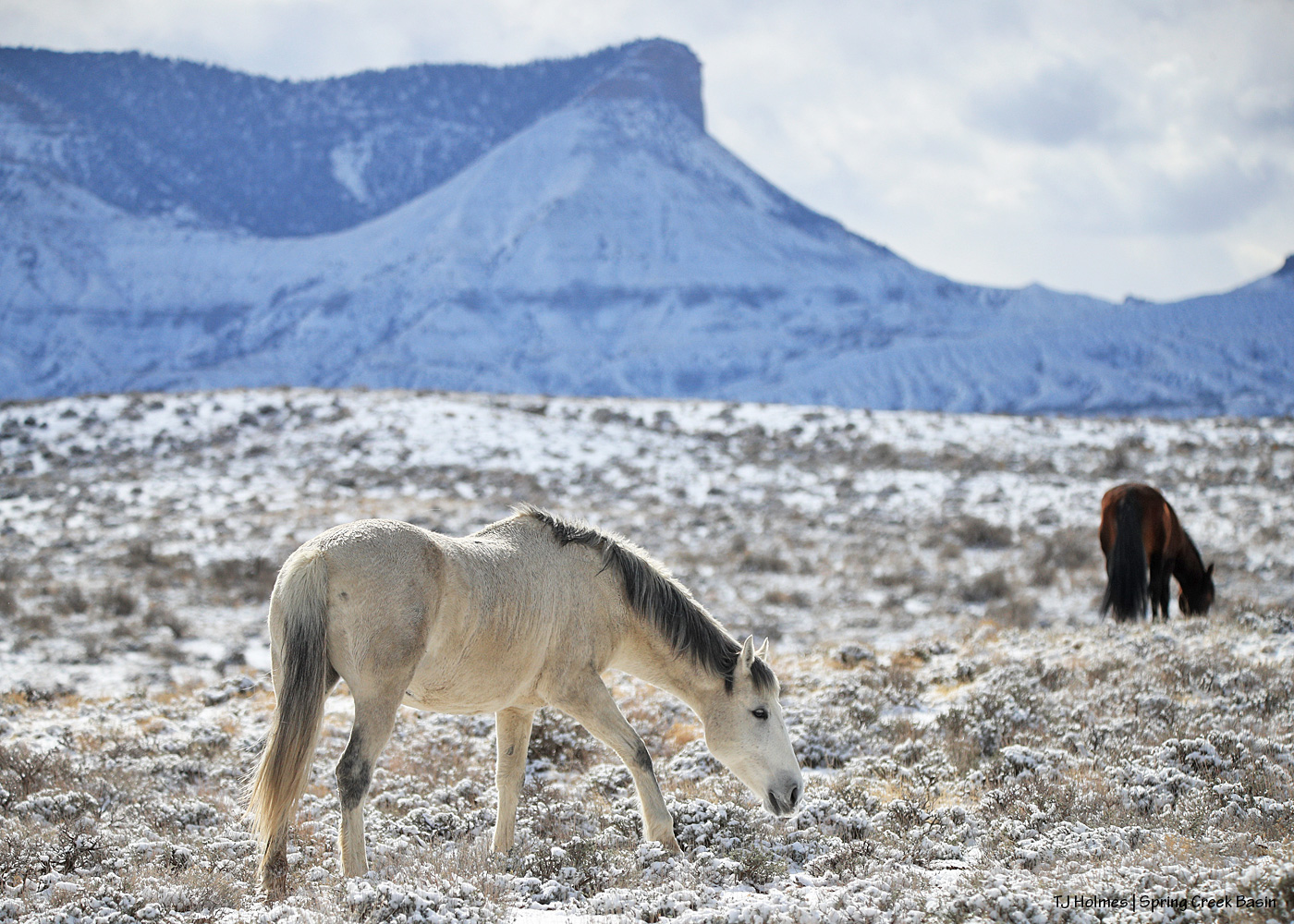 The snow melted much too fast, but as usual, the horses and the scenery deserved at least another look on another post. 🙂 This is Temple, seeking out bits of green in the white; Sancho is a bit farther away.