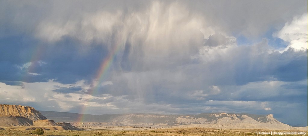 Rainbow over Spring Creek Basin from the Disappointment Valley road. … See the double? Unfortunately, we didn’t get any rain out of this one.