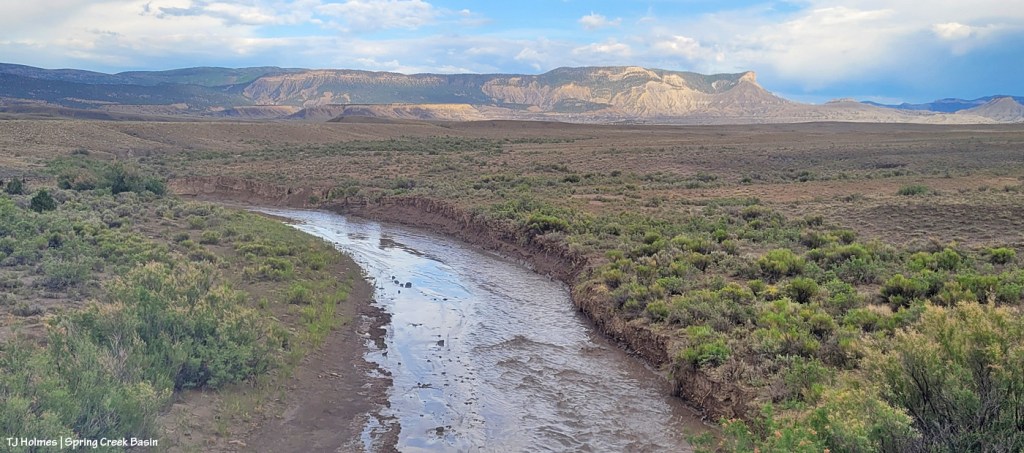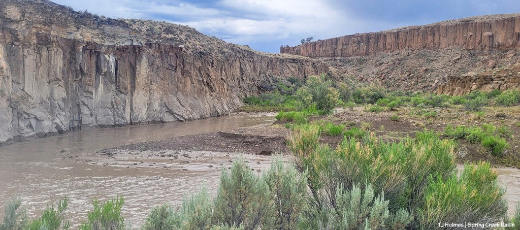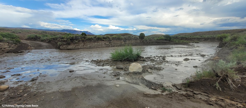 Ha! Only sometimes. π When there’s a big rain event over the basin – usually, a hard rain that does more running off than soaking in – Spring Creek runs. It doesn’t last long; the next day, it showed evidence of having run … but the only water was in random puddles. Spring Creek and its tributary arroyos drain Spring Creek Basin … and all those arroyos feed into each other and, ultimately, Spring Creek. Water in a desert; following its path(s) is fascinating. π