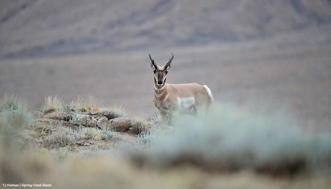 The pronghorn buck Chipeta and the other mustangs were very interested in. Here, he’s literally right at the rimrock’s edge (a band of rimrock cliffs forms most of Spring Creek Basin’s western boundary). I spotted him first, from the far side of a little hump of ground. Then he spotted me and decided that the mustangs must be warned of the “stranger” in their midst! Fortunately, though I was a stranger to him, I am not a stranger to *them*.