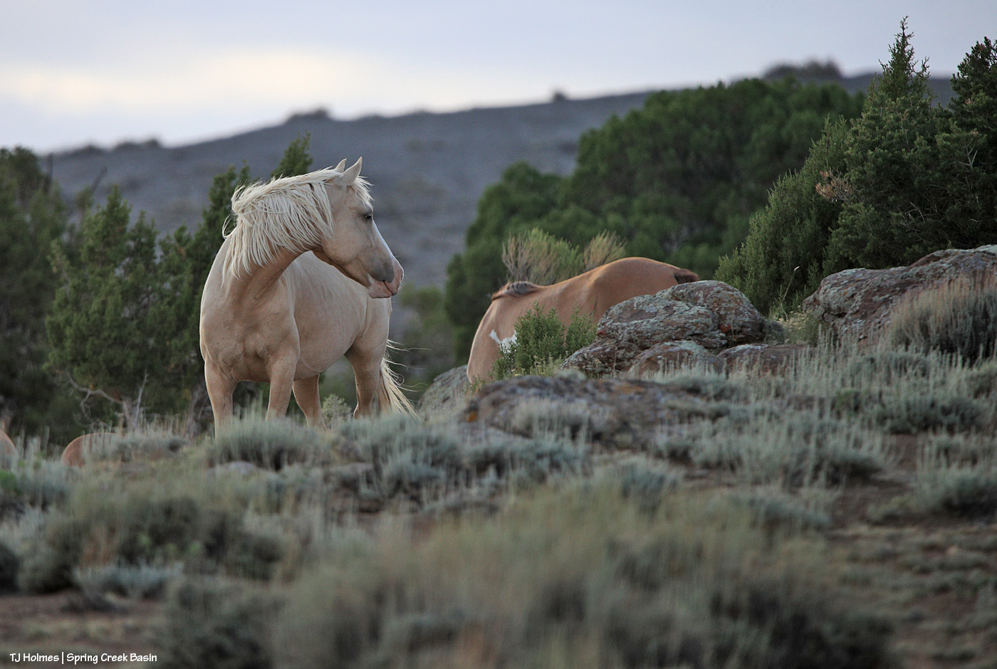Rowan keeps an eye out for anything that’s *not right* while the band grazes among the rocks in the high northwestern part of Spring Creek Basin. This was a different area than where the horses normally are, and I liked the different look of it. There was a lot of chattering from, I think, pinyon jays, and I think that’s what caught her attention. … Either that, or another band over a bit of a ridge.