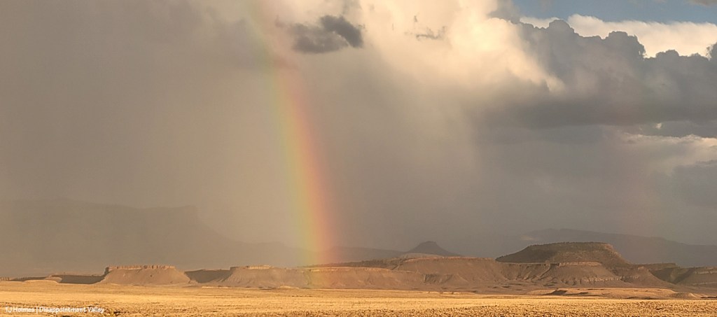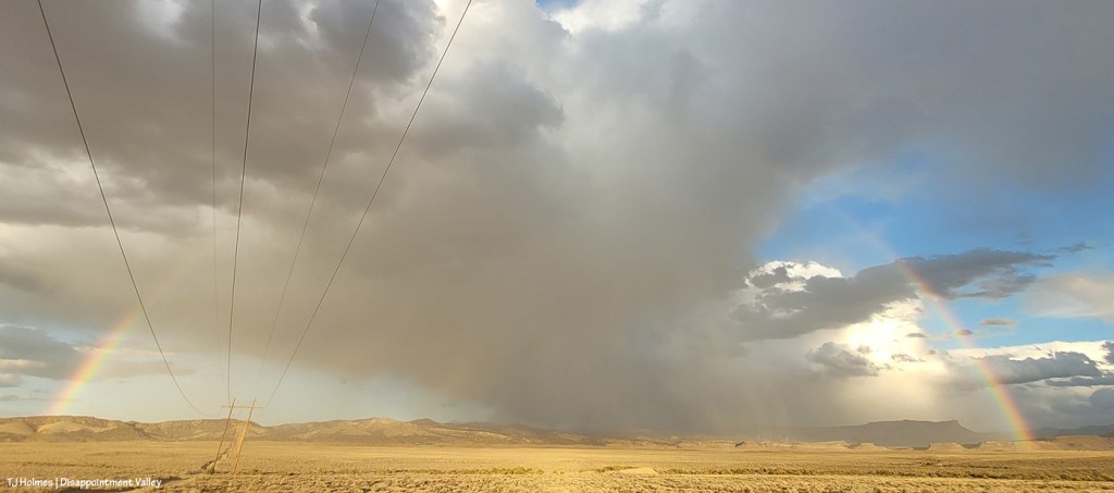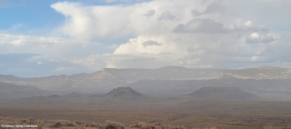 I stood in the sunshine along Disappointment Road while the second wave of rain passed from south to north across Spring Creek Basin (the rimrocks are Spring Creek Basin’s western boundary; the basin stretches away to the east in the northeasternish part of Disappointment Valley).