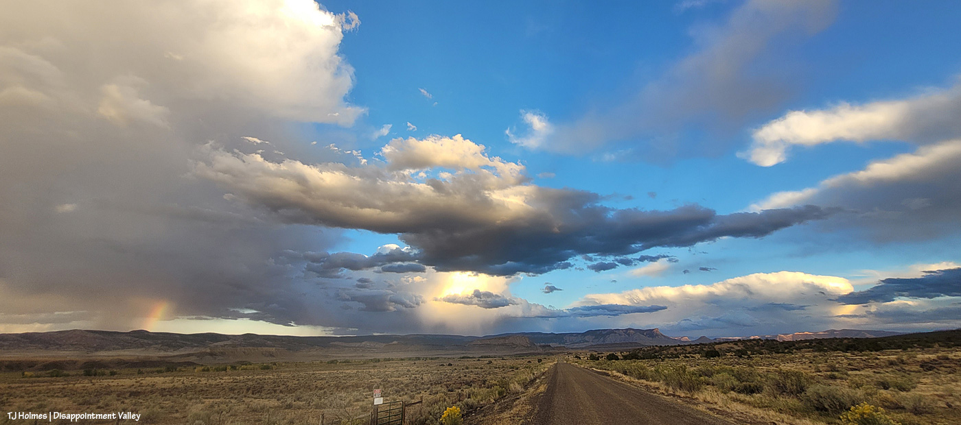 This is NOT part of the original/above rainbows; it was a newly formed prism as the rain continued to pass and clear and the sun found space beneath the clouds above the western horizon. This stretch of Disappointment Road goes straight east.