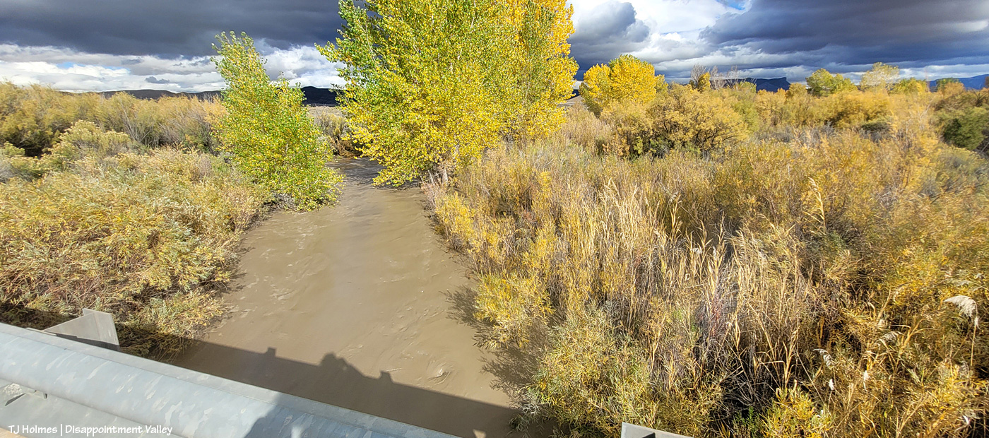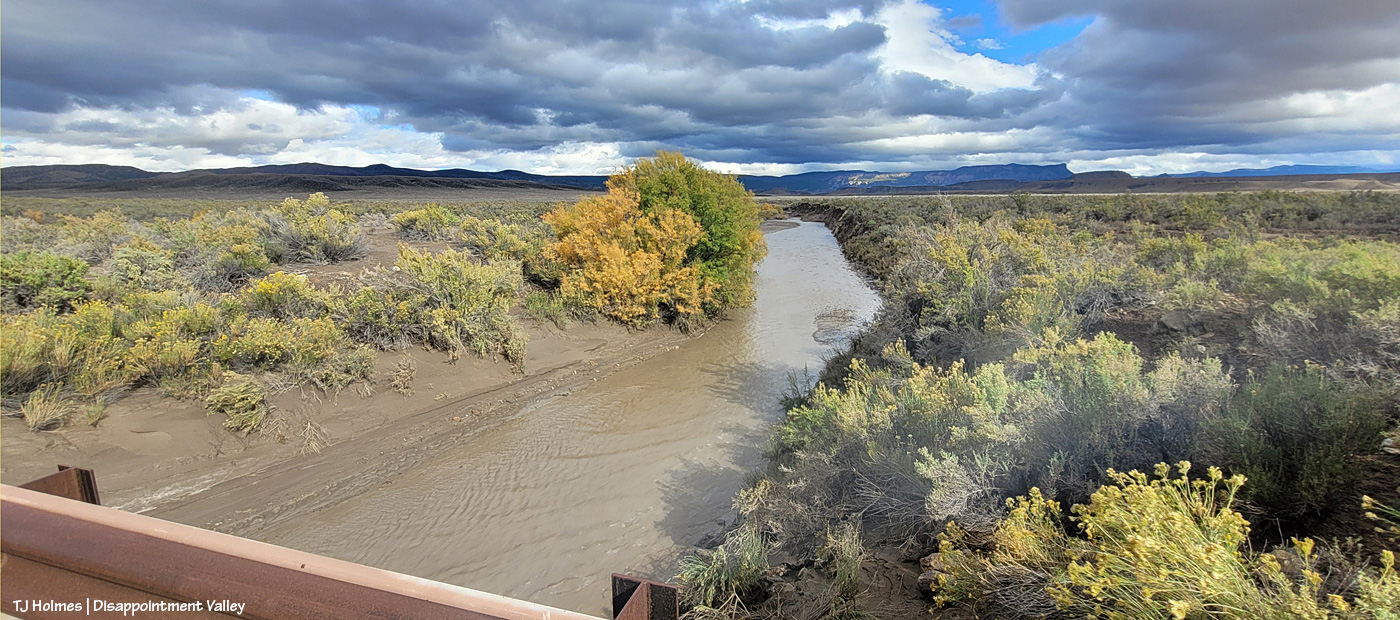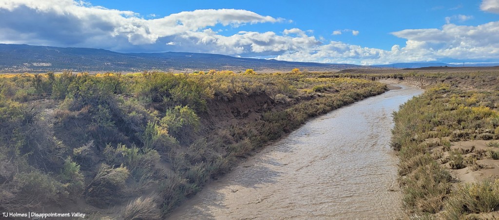 It’s hard to tell either how wide or how deep the water is here in Disappointment Creek several miles up-valley from the turn to Spring Creek Basin off Disappointment Road, but given that it was previously dry, I *hope* you can see that it’s running like a milk-chocolate river. This is looking upstream.
