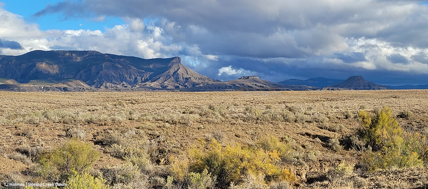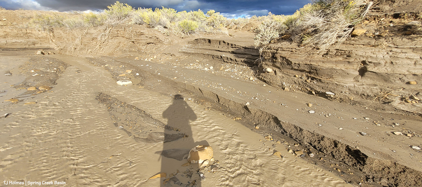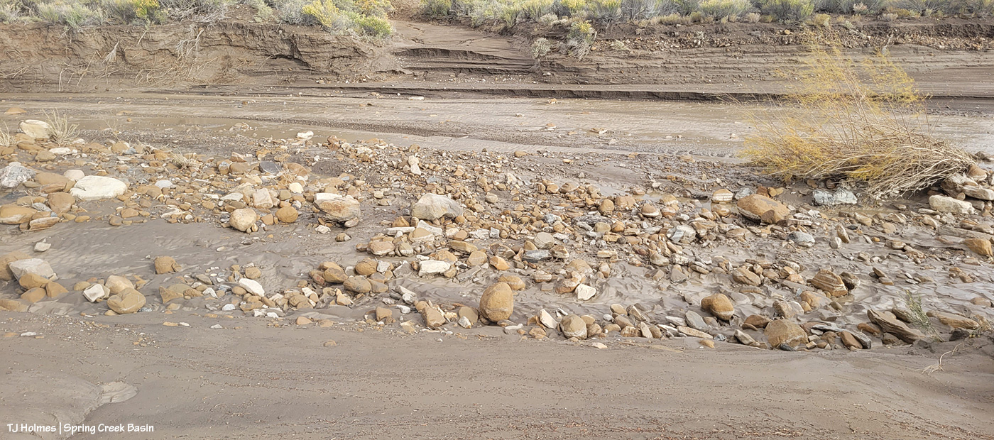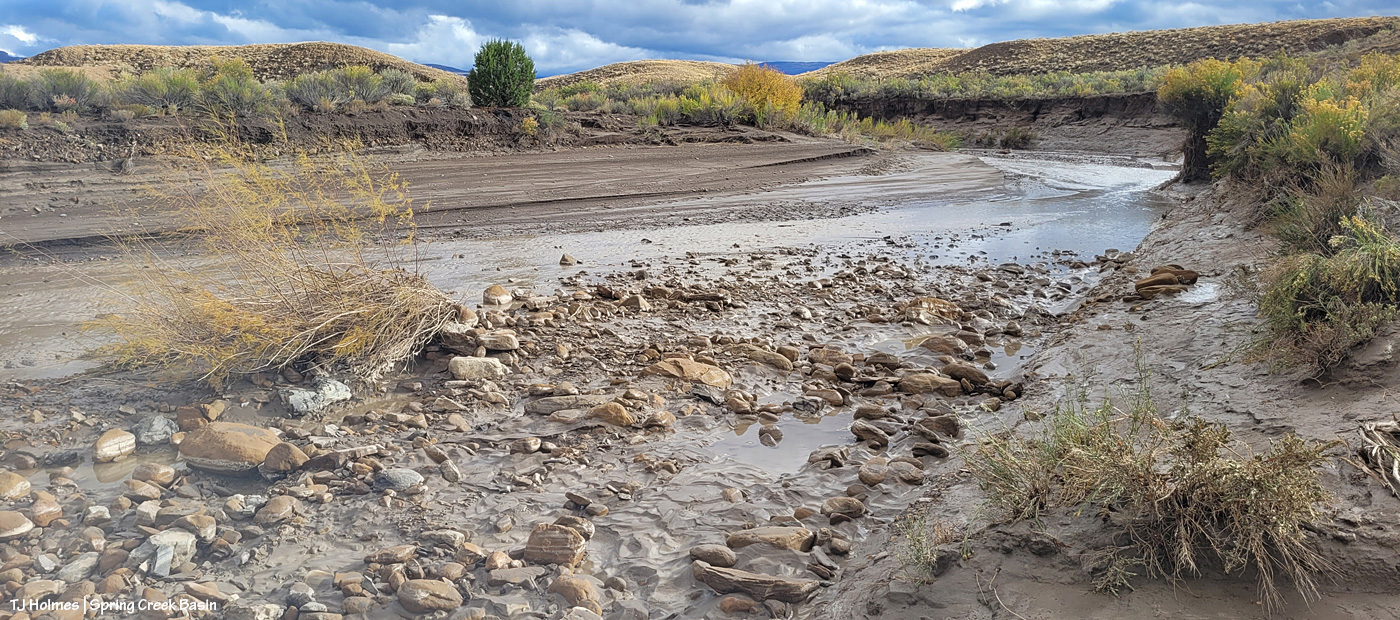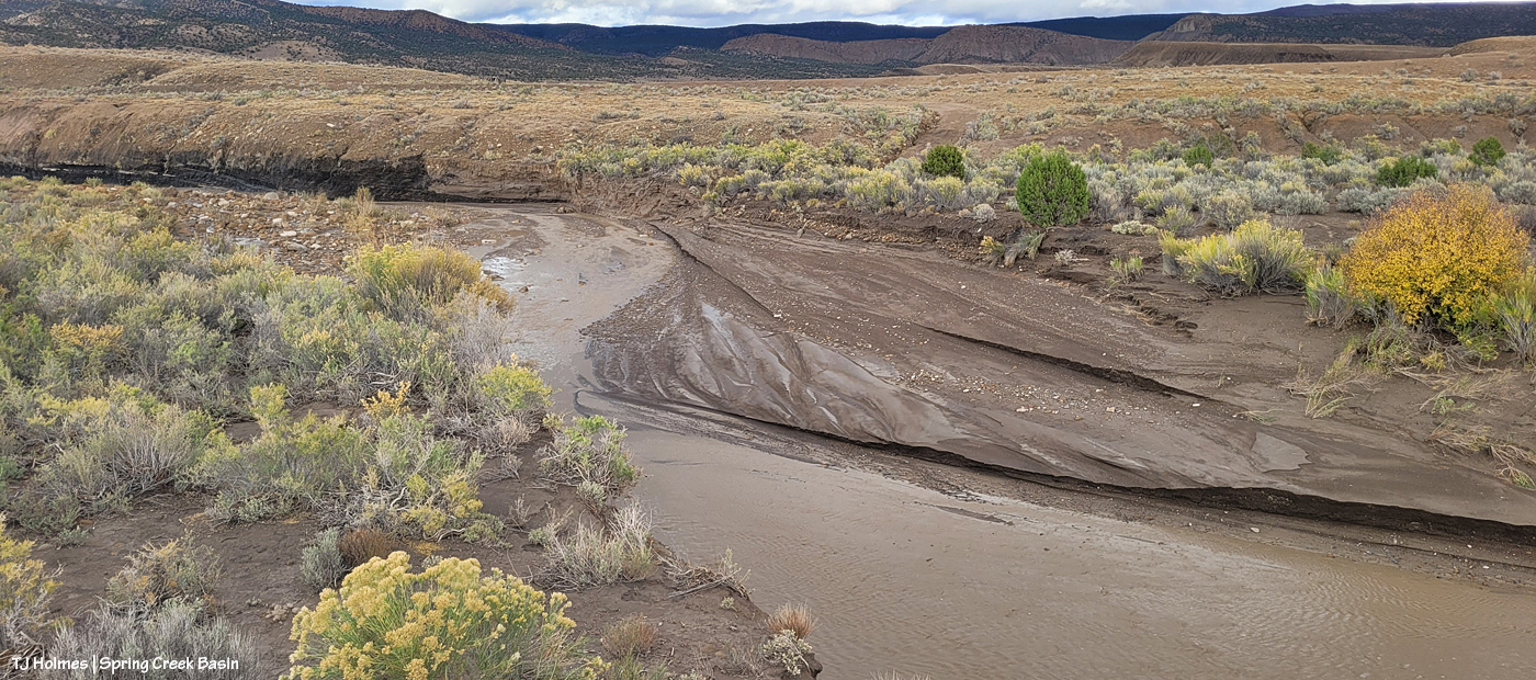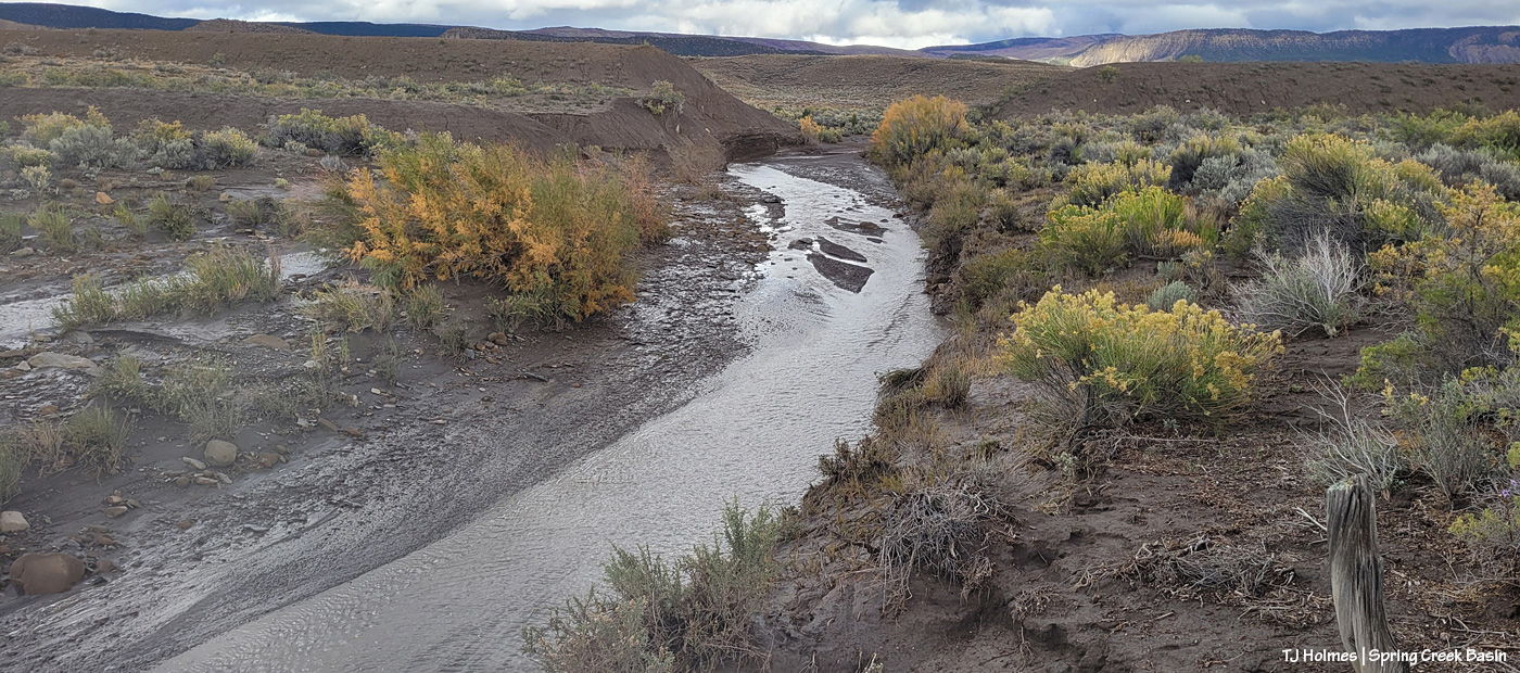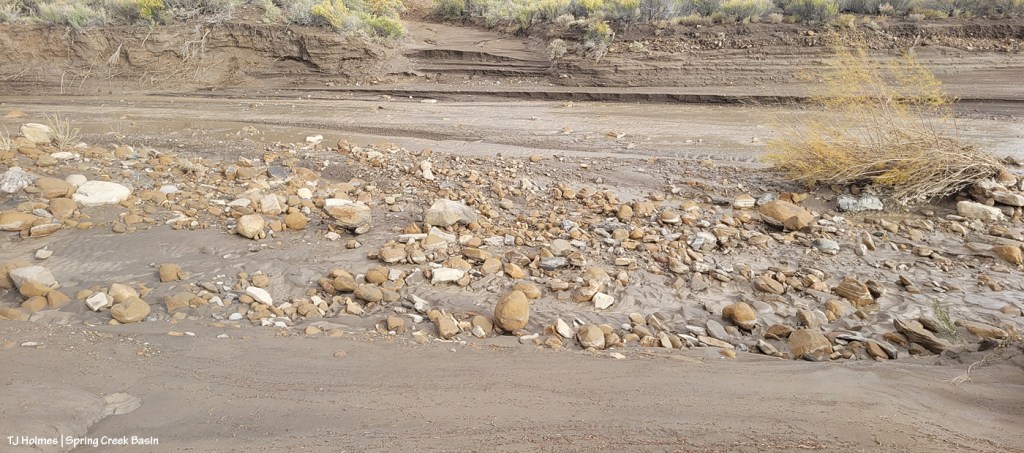 Then I went looking for the condition of the Spring Creek arroyo in Spring Creek Basin (in case this isn’t obvious, Spring Creek and its tributary arroyos drain Spring Creek Basin – when it rains – and the main Spring Creek arroyo carries all that gathered water west across Disappointment Valley to join the also-muddy water of Disappointment Creek, and together, they carry the watershed’s drainage to the Dolores River).